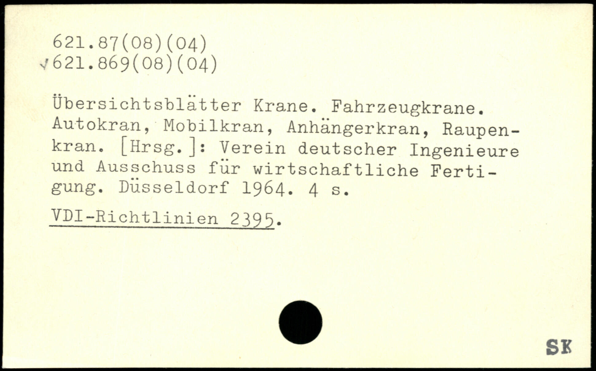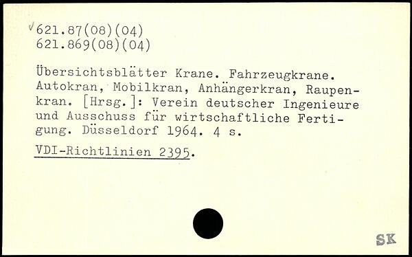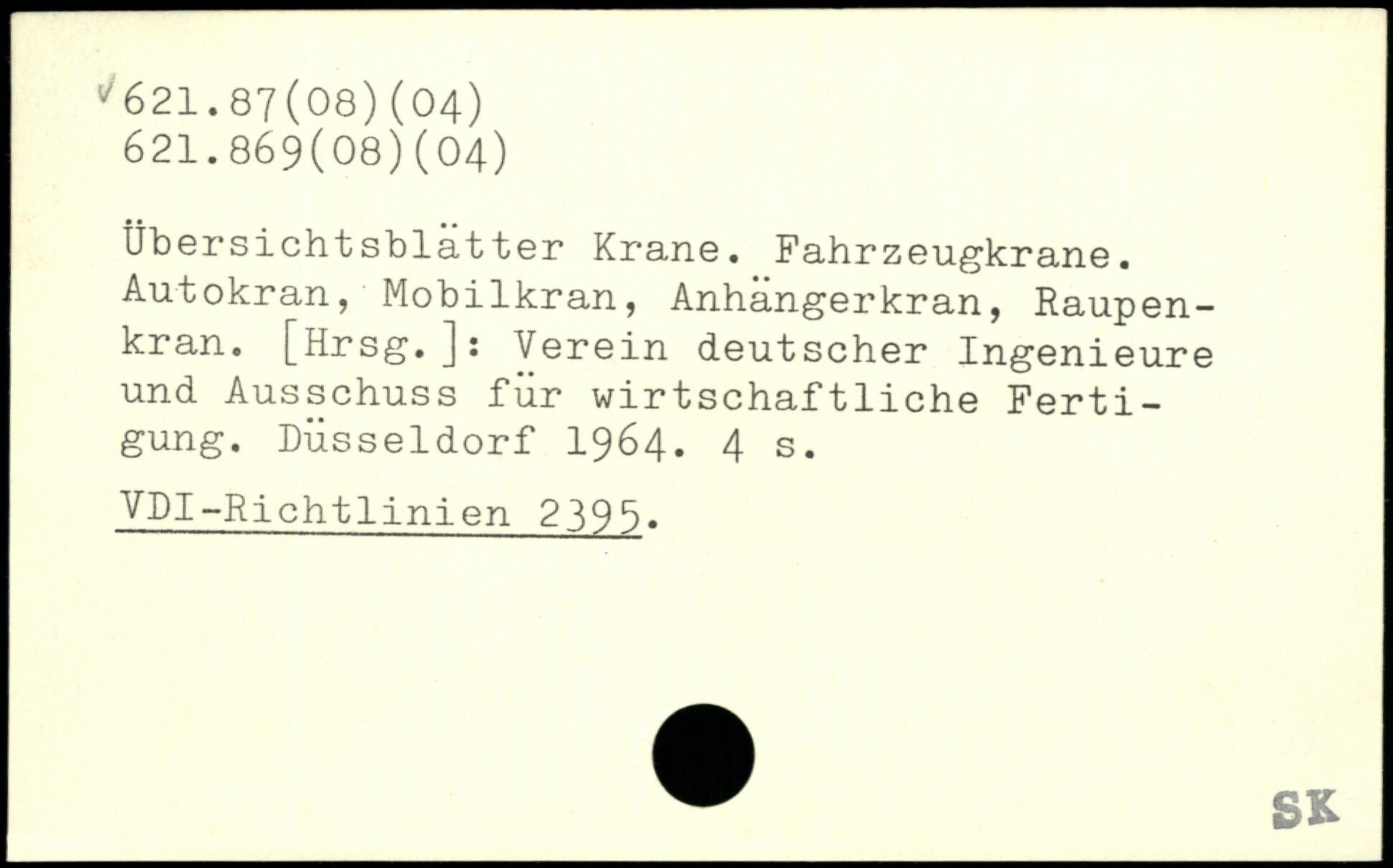 Übersichtsblatter Krane. Fahrzeugkrane. Autokran, Mobilkran, Anhangerkran, Raupenkran. [Hrsg.]: Verein deutscher Ingenieure und Ausschuss für wirtschaftliche Fertigung. Düsseldorf 1964.