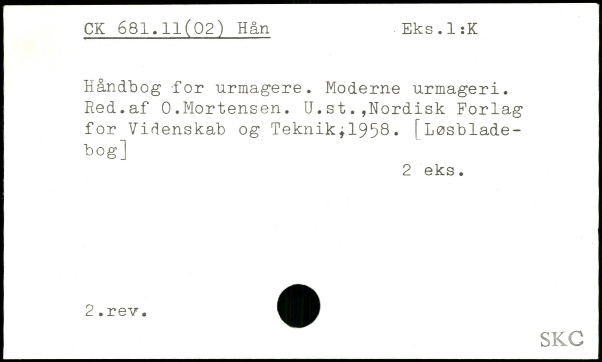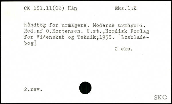 Håndbog for urmagere. Moderne urmageri. Red.af 0.Mortensen. U.st.,Nordisk Forlag for Videnskab og Teknik;1958.