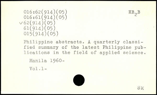 Philippine abstracts. A quarterly classified summary of the latest Philippine publications in the field of applied science.. Manila 1960- Vol.l-