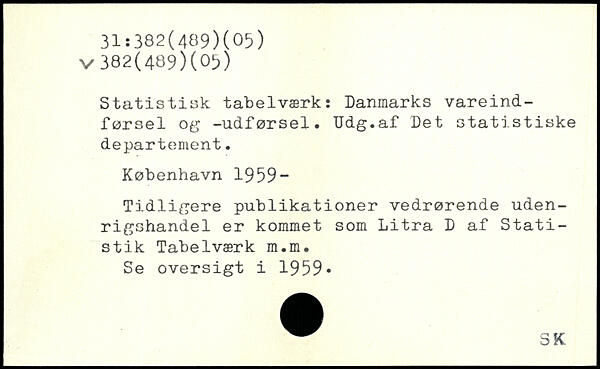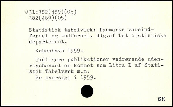 Statistisk tabelværk: Danmarks vareindførsel og -udførsel. Udg.af Det statistiske departement.