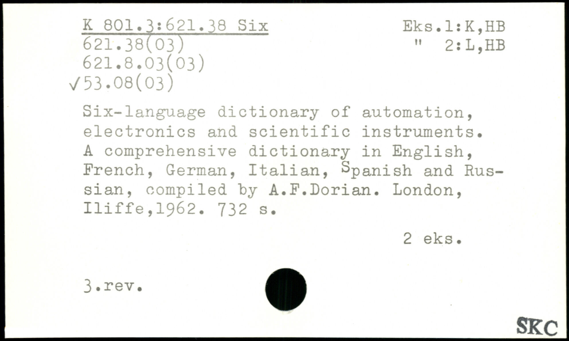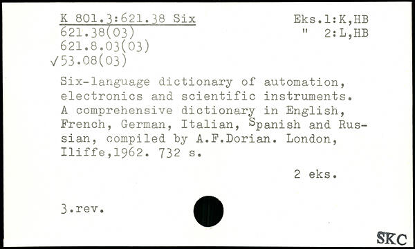 Six-language dictionary of automation, electronics and scientific instruments. A comprehensive dictionary in English, French, German, Italian, Spanish anci Russian, compiled hy A.F.Dorian.