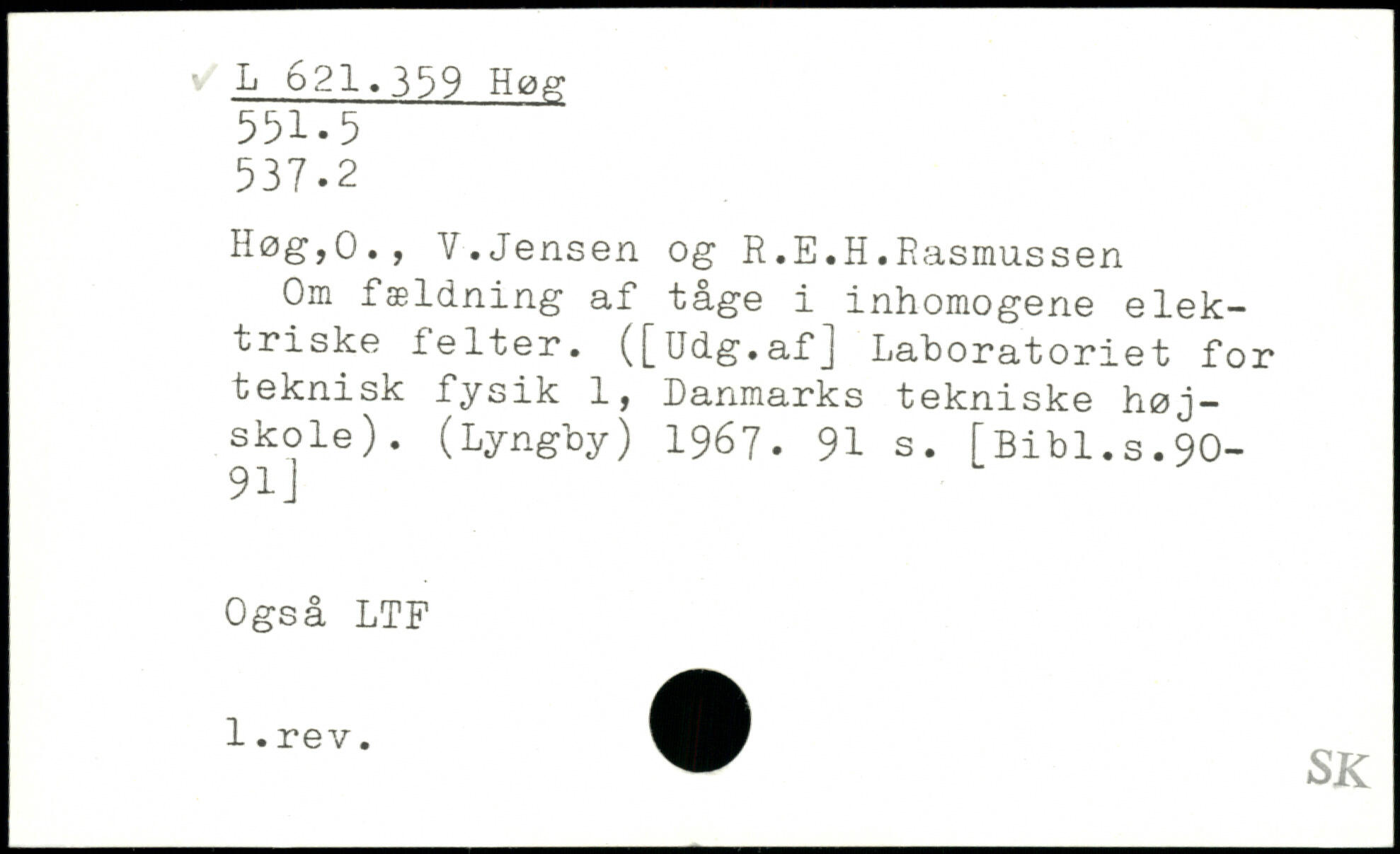 Om fældning af tåge i inhomogene elektriske felter. ([Udg.afJ Laboratoriet for teknisk fysik 1, Danmarks tekniske højskole). (Lyngby) 1967.