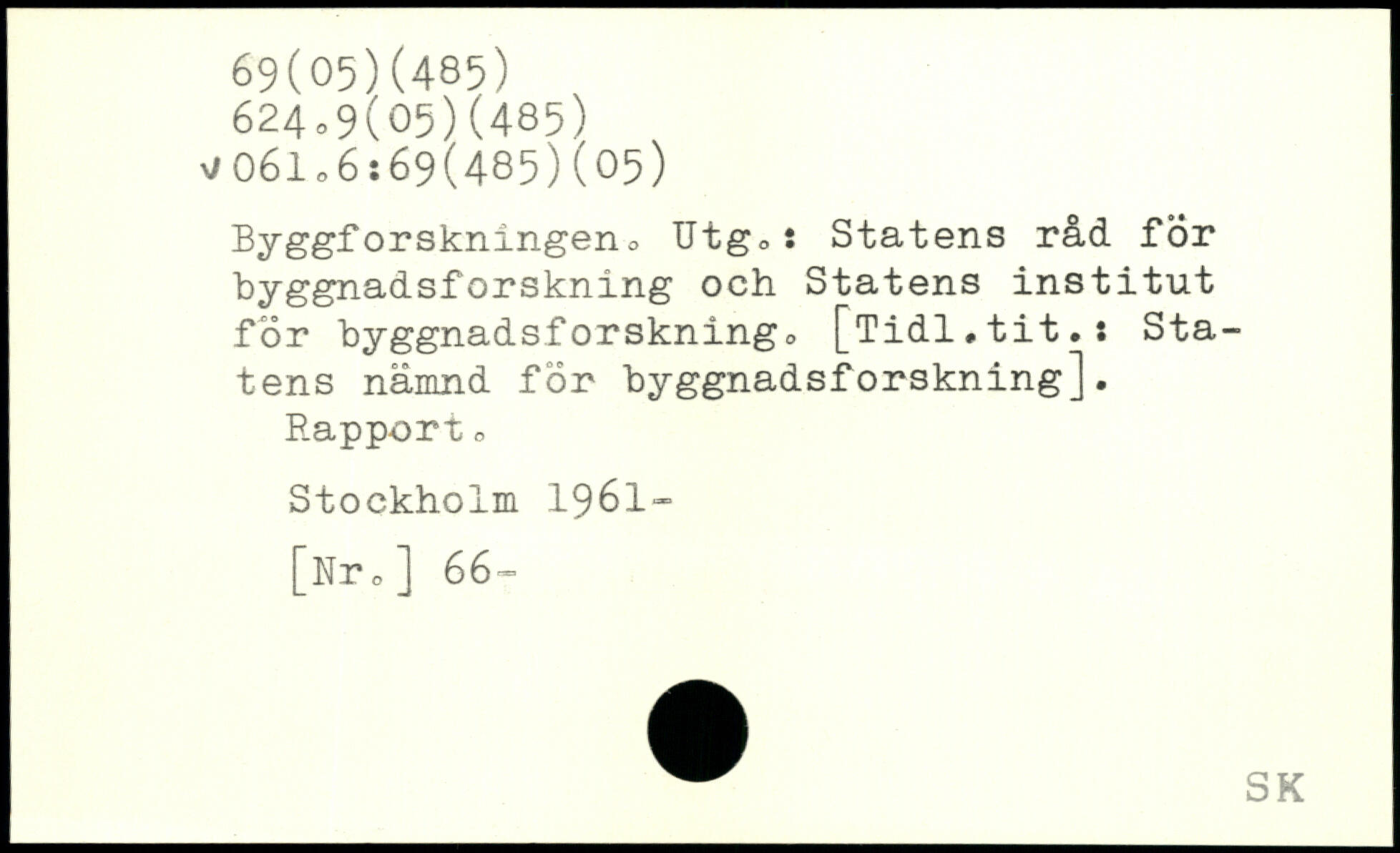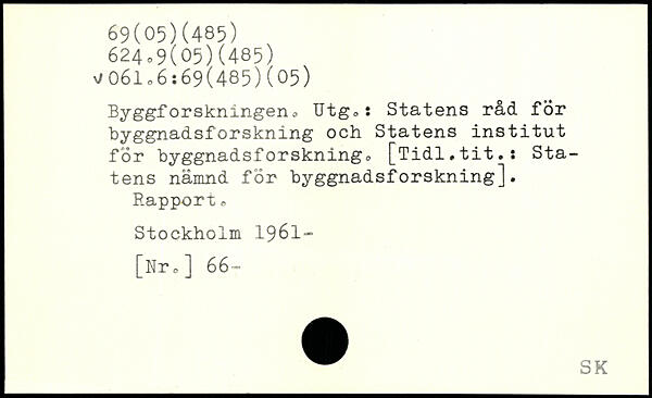 Byggforskningeno Utg,: Statens råd för byggnadsforskning och Statens institut för hyggnadsforskningo [Tidl.tit.: Statens nämnd för hyggnadsforskning]. Rapport o