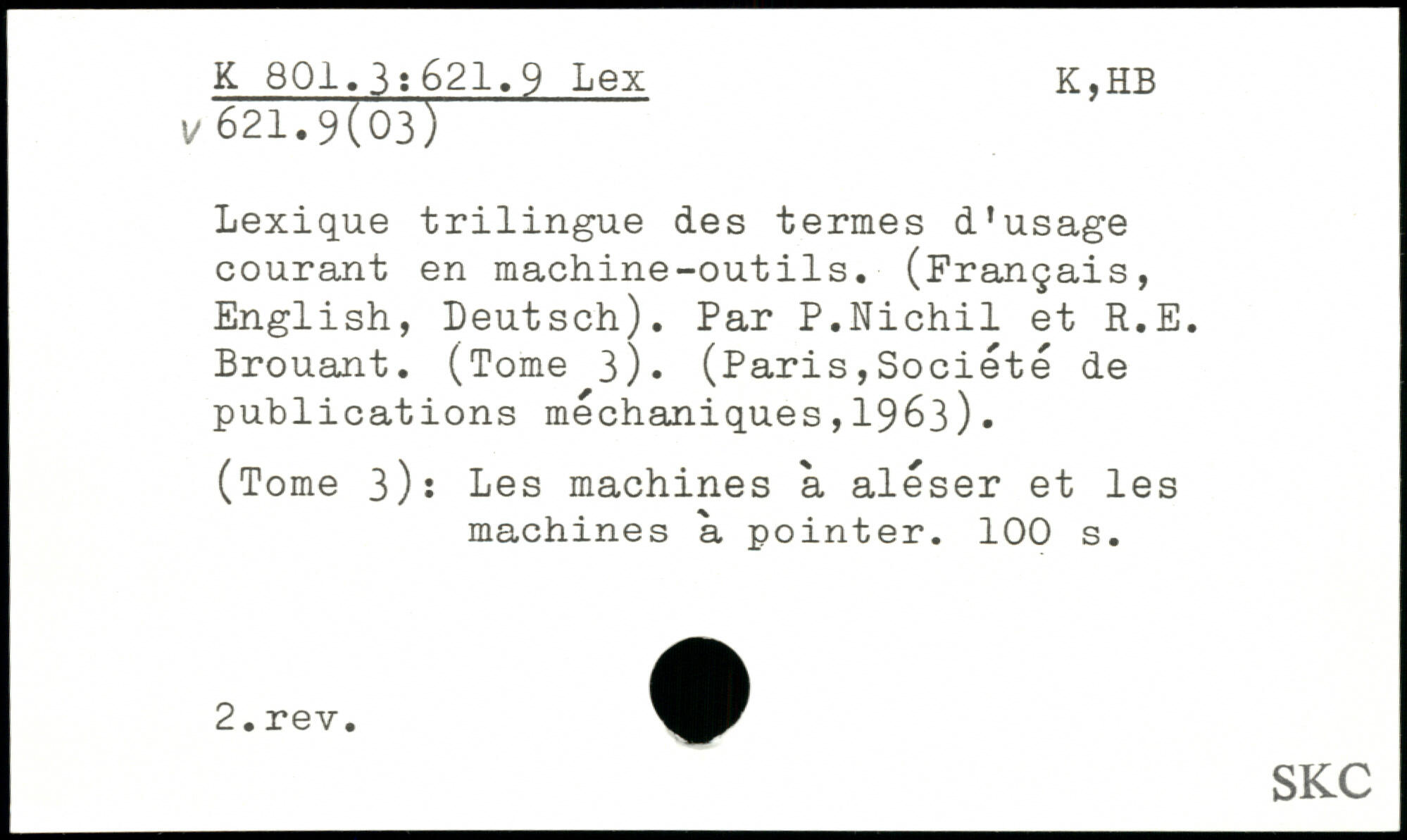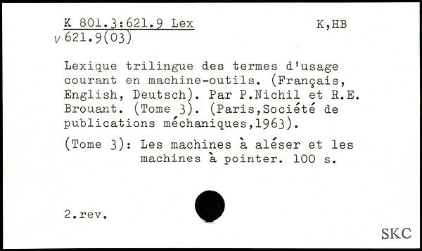 Lexique trilingue des termes d'usage courant en machine-outils. (Français, English, Deutsch). Par P.Nichil et R.E. Brouant. (Tome 3). (