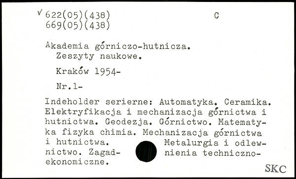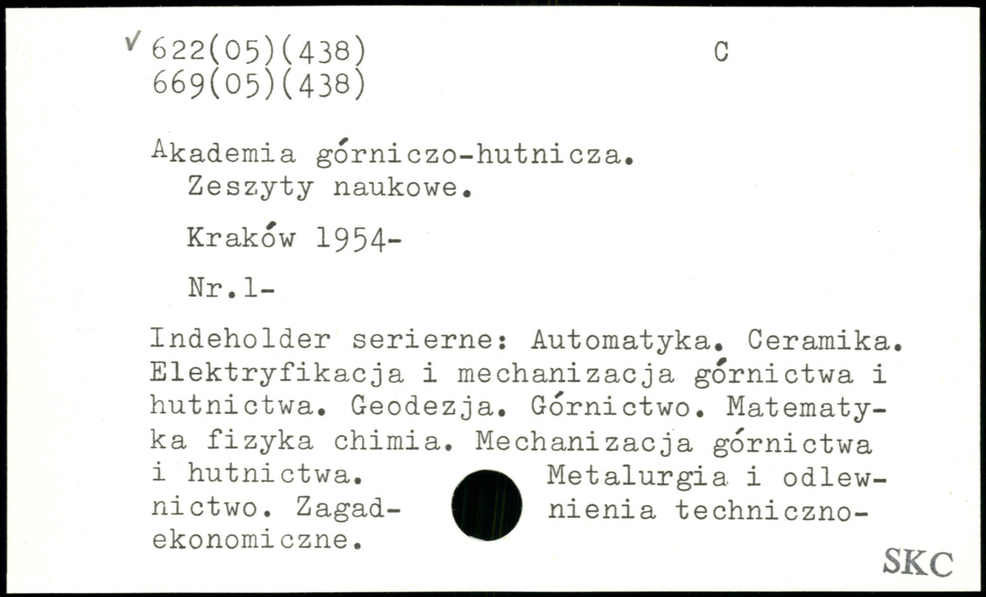 -A-kademia gorniczo-hutnicza. Zeszyty naukowe. Krakow 1954“ Nr. 1- Indeholder serierne: Automatyka. Ceramika. Elektryfikacja i mechanizacja gornictwa i hutnictwa. Geodezja. Gornictwo. Matematy-ka fizyka chimia. Mechanizacja gornictwa i hutnictwa. Metalurgia i odlew- nictwo. Zagad- nienia techniczno- ekonomiczne.