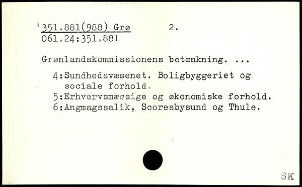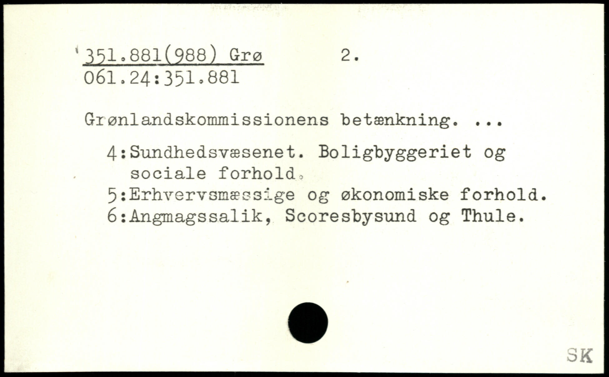Giønlandskommissionens 'betænkning. ... 4:Sundhedsvæsenet. Boligbyggeriet og sociale forhold. 5:Erhvervsmæssige og økonomiske forhold. 6:Angmagssalik, Scoresbysund og Thule. 3 K