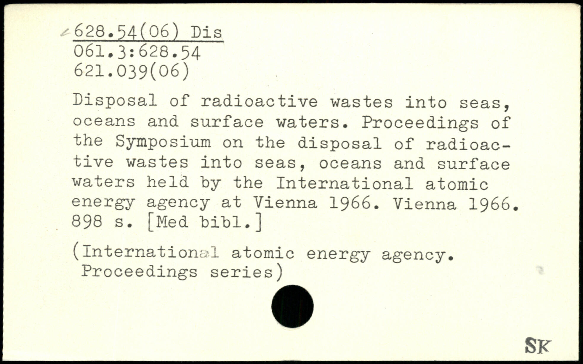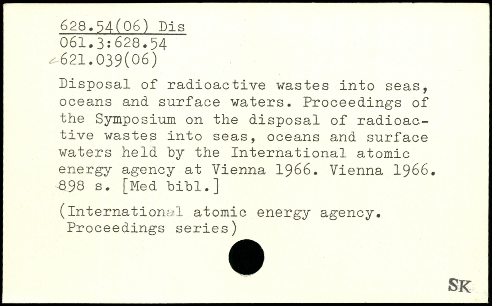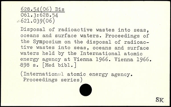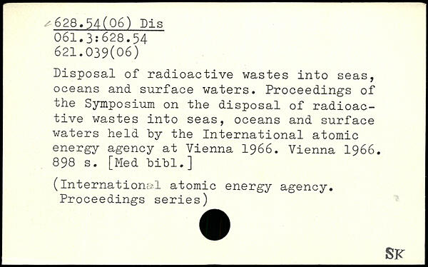 Disposal of radioactive wastes into seas, oceans and surface waters. Proceedings of the Symposium on the disposal of radioactive wastes into seas, oceans and surface waters held by the International atomic energy agency at Vienna 1966. Vienna 1966. -33Q s. [Med bibl.]