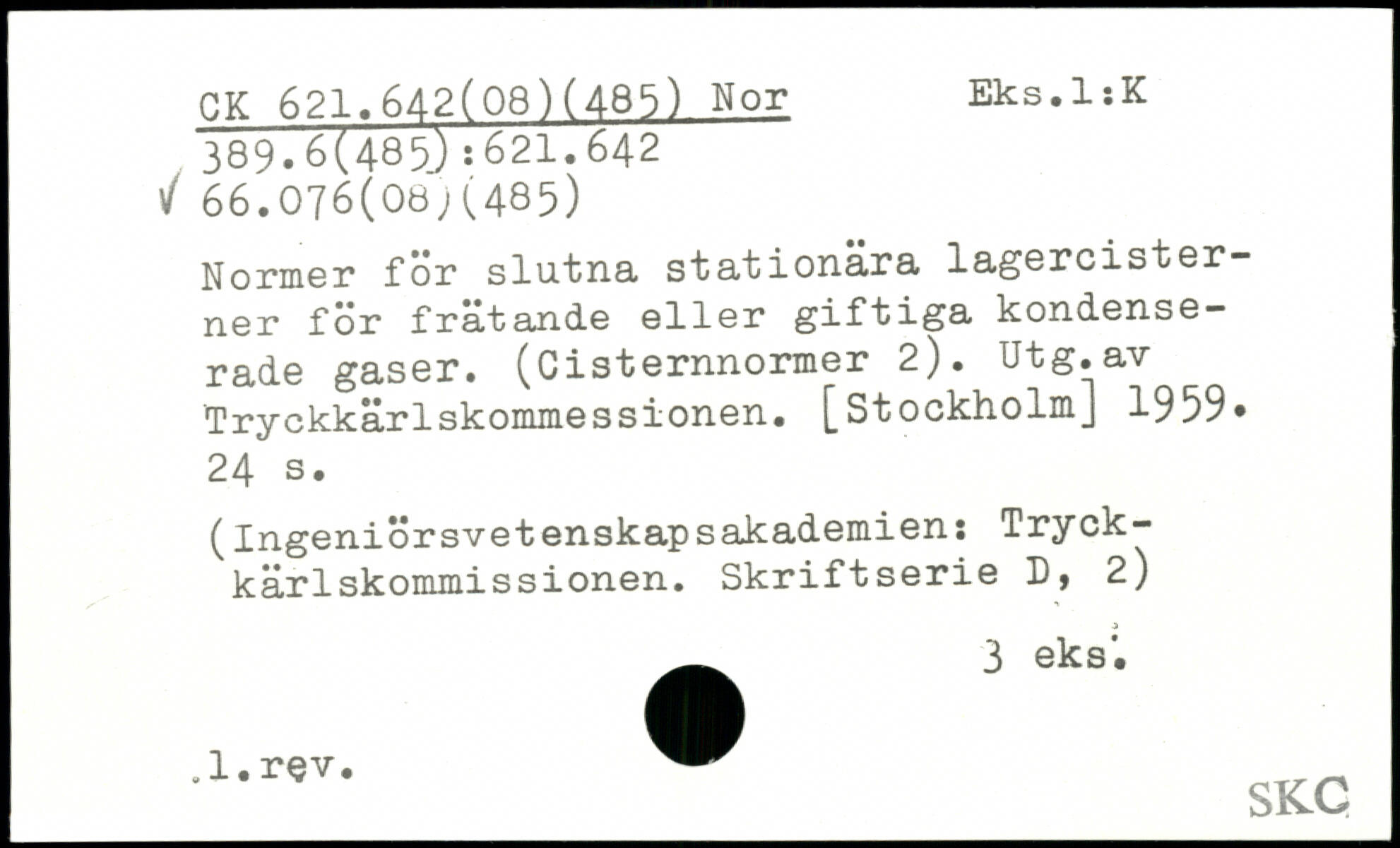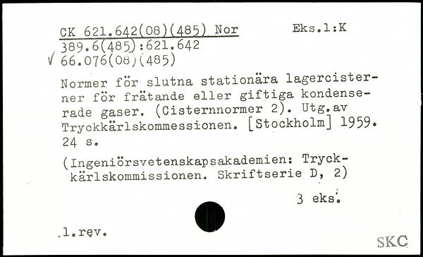 Normer för slutna stationära lagercisterner för frätande eller giftiga kondenserade gaser. (Cisternnormer 2). Utg.av Tryckkärlskommessionen.