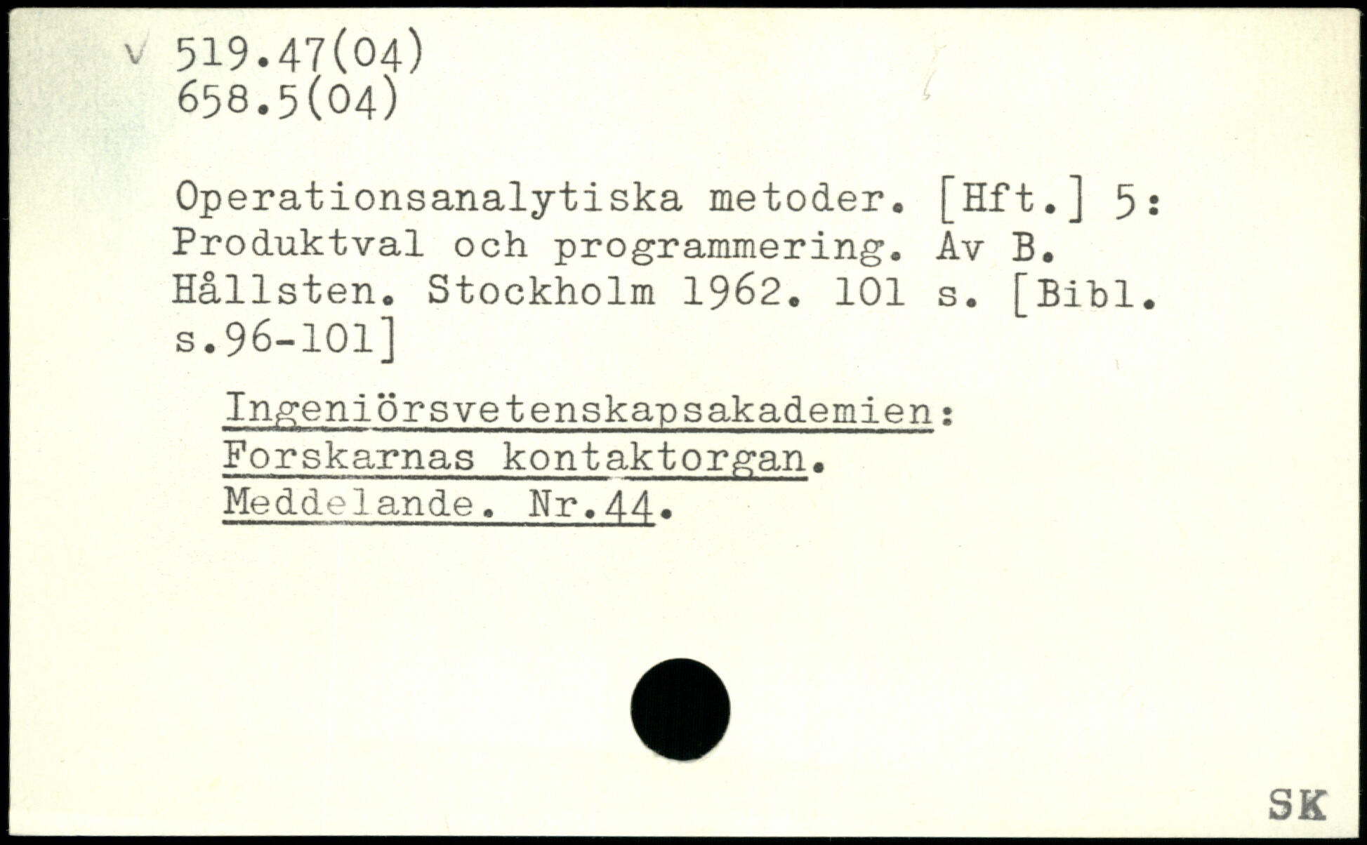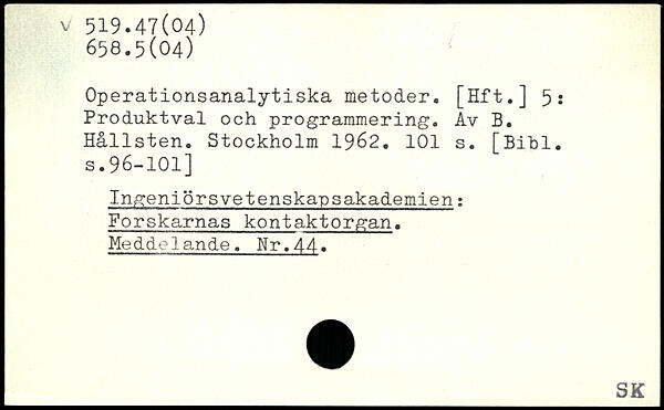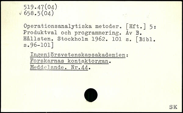 Operationsanalytiska metoder. [Hft.] 5: Produktval och programmering. Av B. Hållsten.