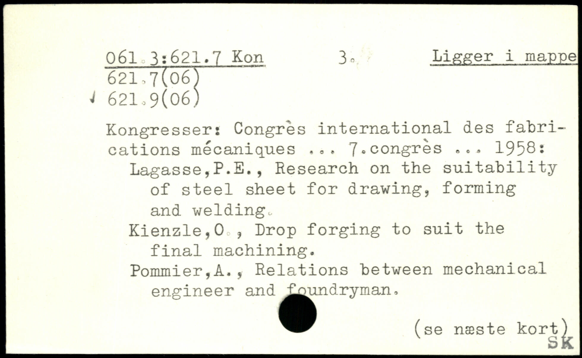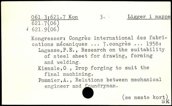 Kongresser: Congrès international des fabrications mécaniques. .. 7,congrès ... 1958. Lagasse,P.E., Research on the suitability of steel sheet for drawing, forming and welding. Kienzle,0,, Drop forging to suit the final machining. Pommier,A., Relations between mechanical engineer and ^^undryman,
