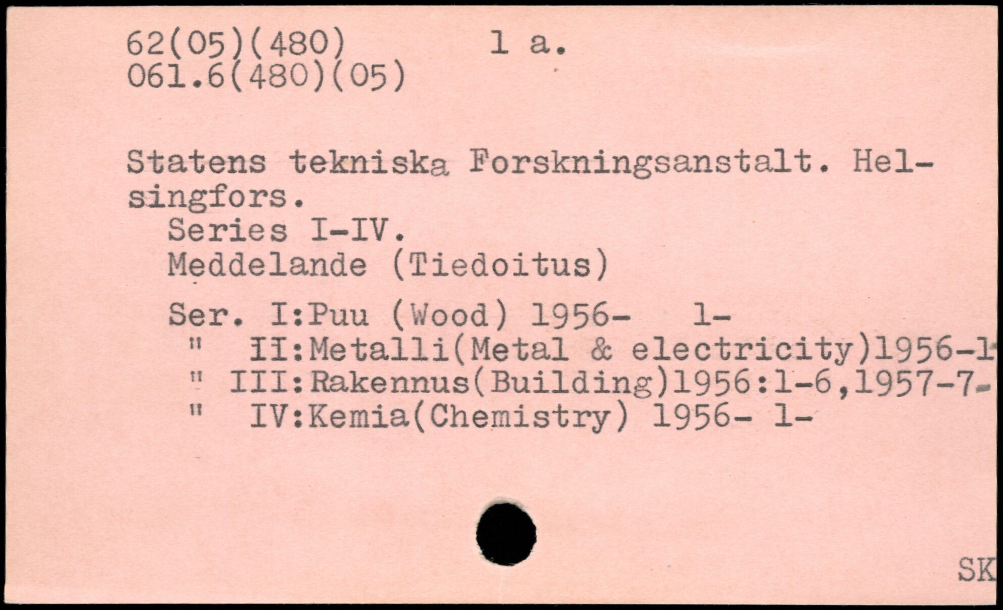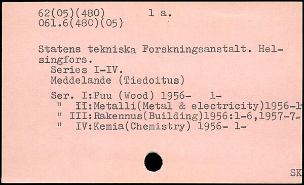 Statens tekniska Forskningsanstalt. Helsingfors. Series I-IV. Meddelande (Tiedoitus) Ser. I:Puu (Wood) 1956- 1- " II:Metalli(Metal & electricity)1956-1 " IllsRakennus(Building)1956:1-6,1957-7-" IV:Kemia(Chemistry) 1956- 1-