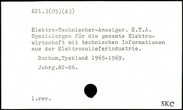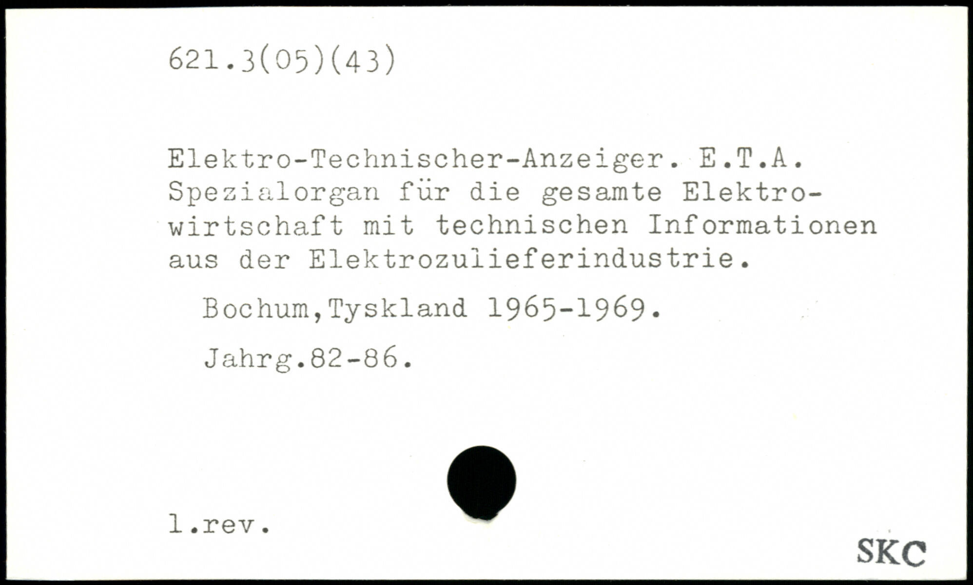 Elektro-Technischer-Anzeiger. E .T.A. Spezialorgan für die gesamte Elektrowirtschaft mit technischen Informationen aus der Elektrozuiieferindustrie. Bochum,Tyskland 1965-1969. Jahrg.82-86.