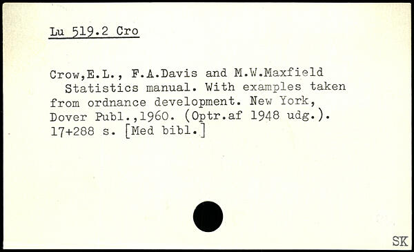 Crow,E.L., F.A.Davis and M.V.Maxfield Statistics manual. With examples taken from ordnance development.
