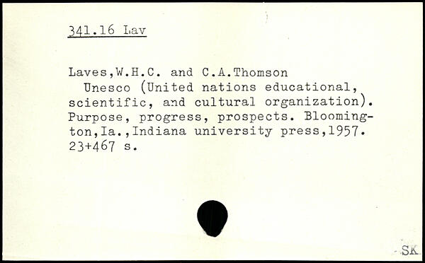 IJnesco (United nations educational, scientific, and cultural organization). Purpose, progress, prospects. Bloomington, la.,Indiana university press,1957.
