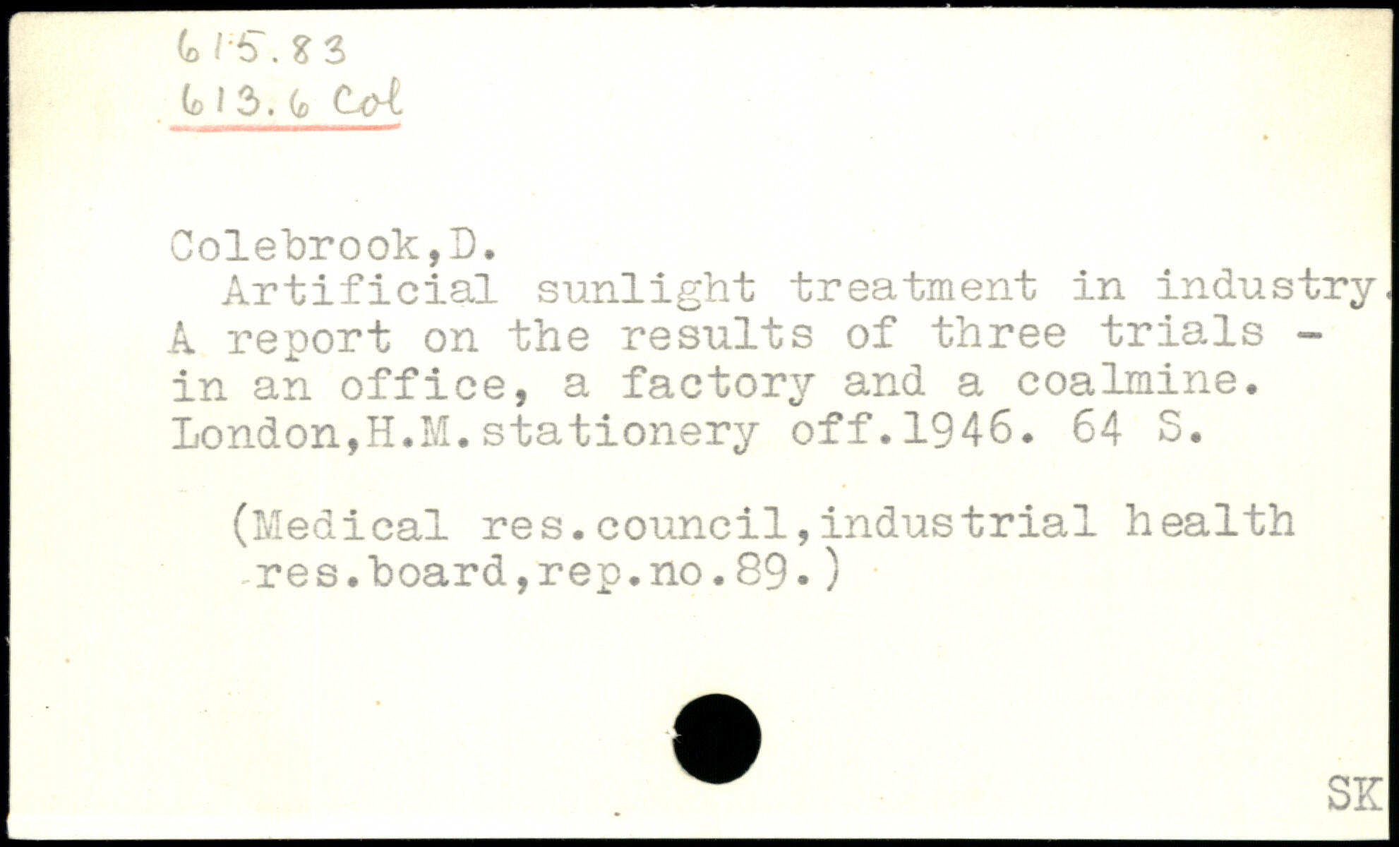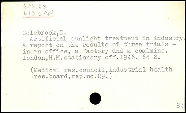 Artificial sunlight treatment in industry, A report on the results of three trials -in an office, a factory and a coalmine. London,H.M.stationery off.1946.