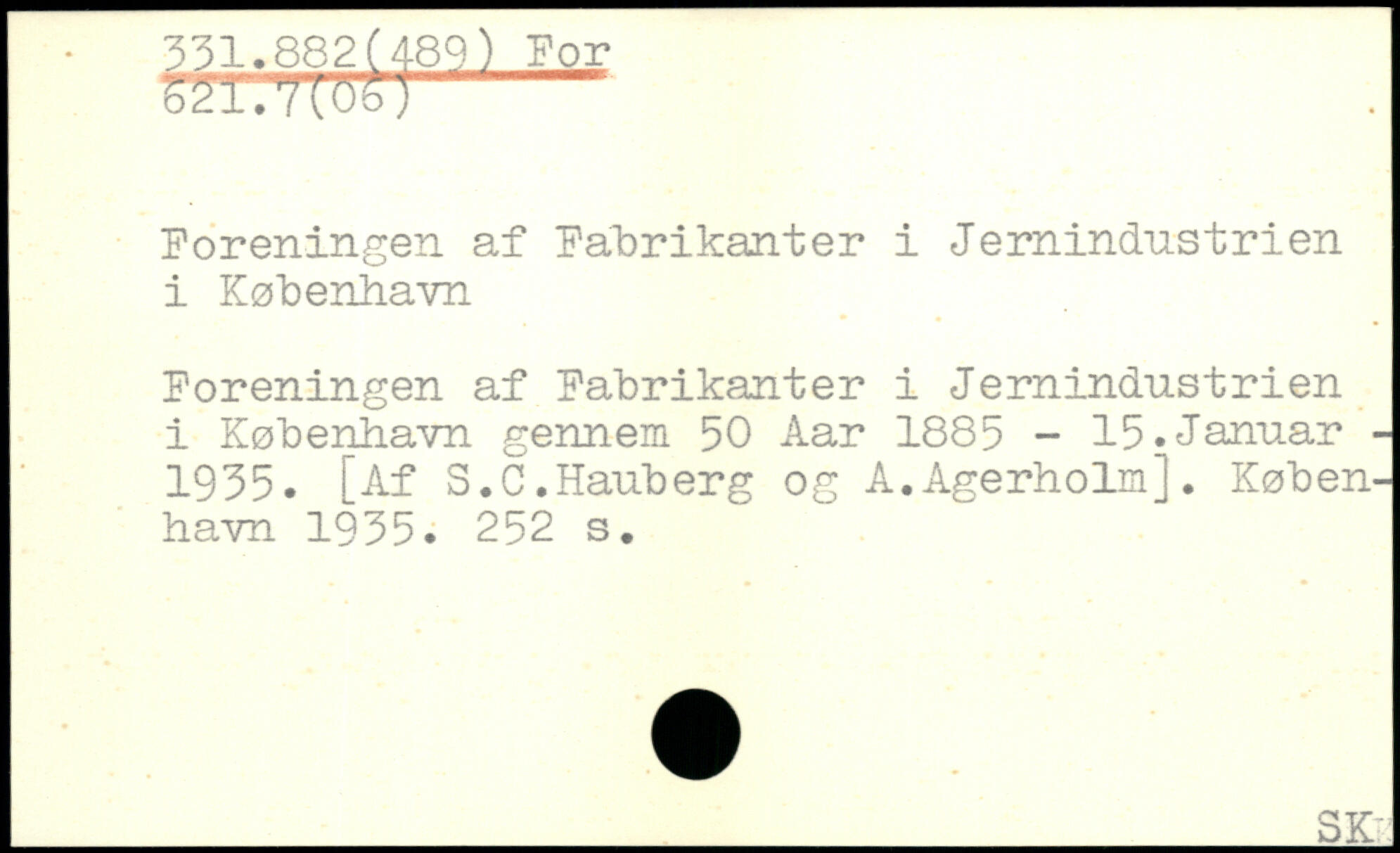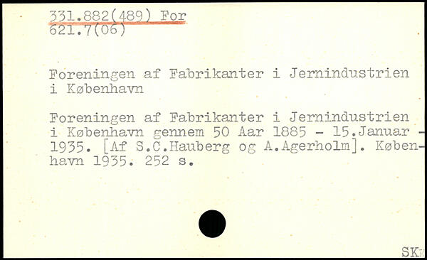 Foreningen af Fabrikanter i Jernindustrien i København Foreningen af Fabrikanter i Jernindustrien i København gennem 50 Aar 1885 - 15.Januar -1935. [Af S.C.Hauberg og A.Agerholm].