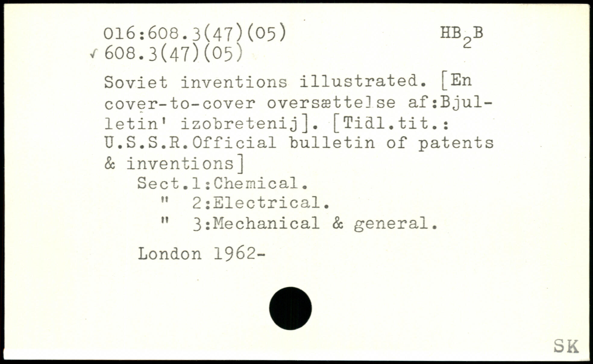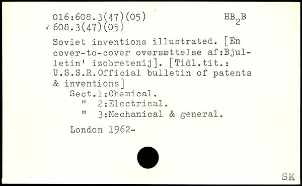 Soviet inventions illustrated. [En cover-to-cover oversættelse af:Bjul-letin’ izobretenij]. [Tidl.tit.: U.S.S.R.Official bulletin of patents & inventions] Sect.1:Chemical. " 2:Electrical. " 3:Mechanical & general.