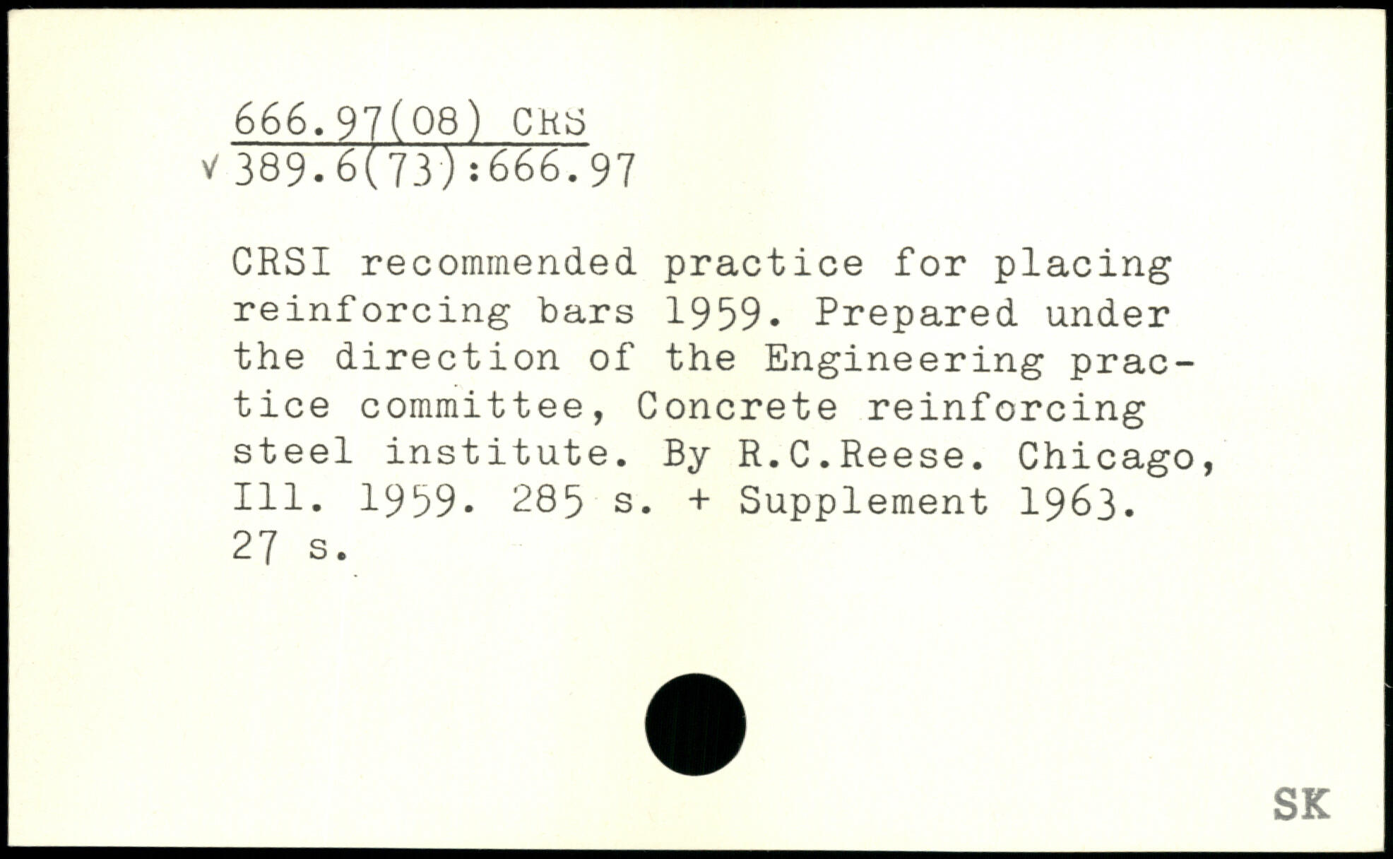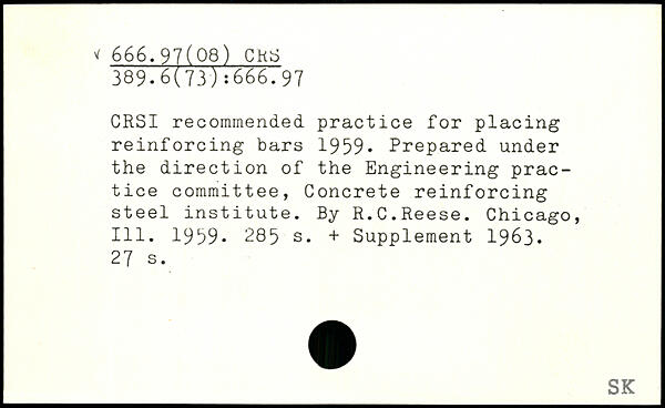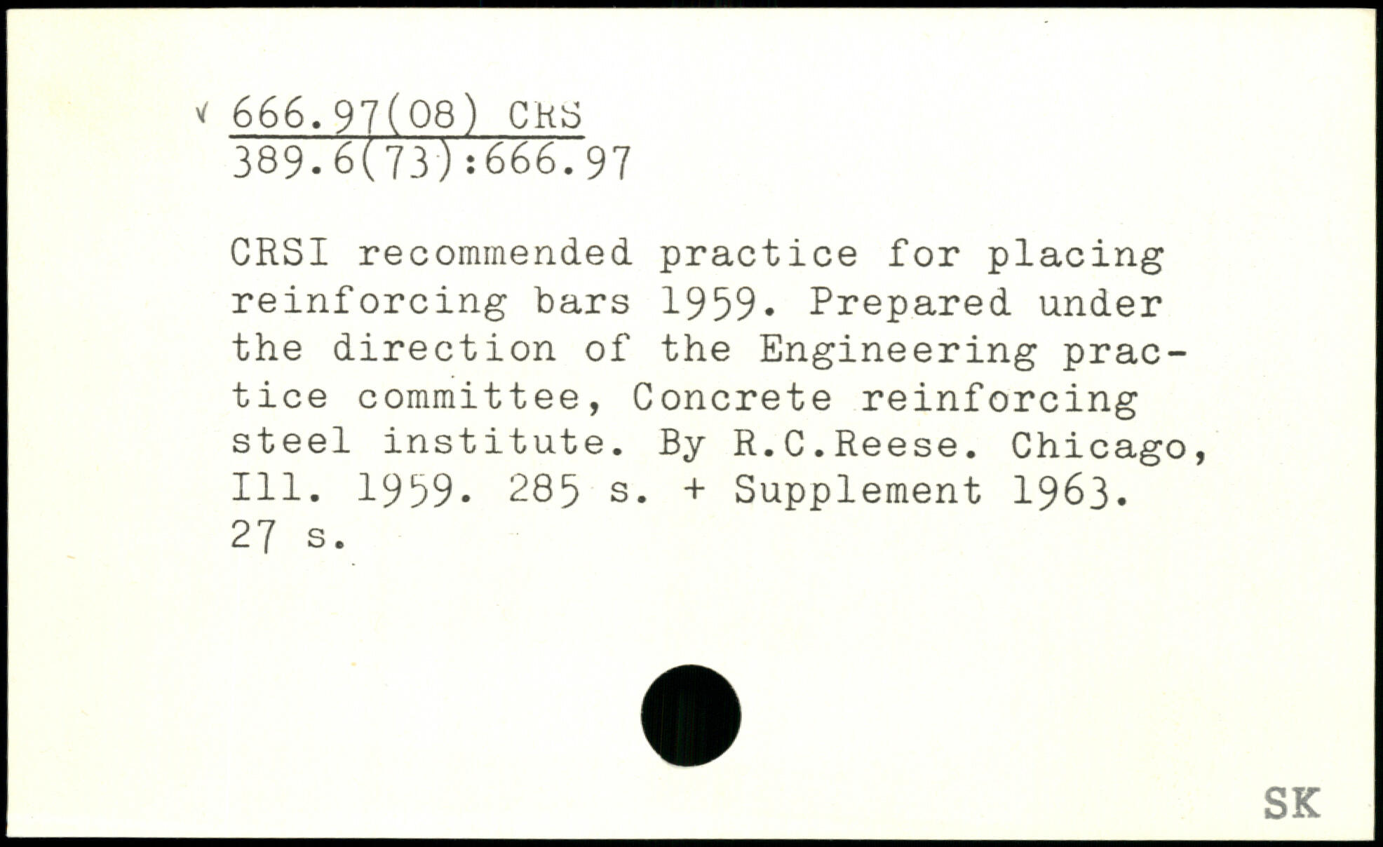 CRSI recommended, practice for placing reinforcing bars 1959. Prepared under the direction of the Engineering practice committee, Concrete reinforcing steel institute. By R.C.Reese. Chicago, 111. 1959.