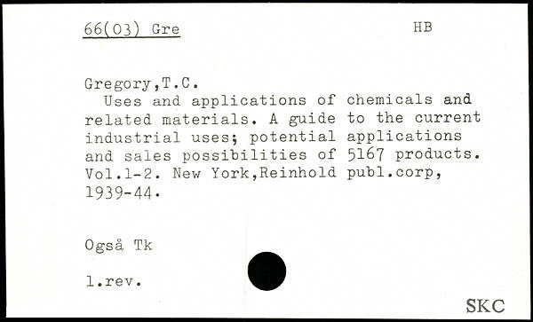 Uses and applications of chemicals and related materials. A guide to the current industrial uses; potential applications and sales possibilities of 5167 Products.