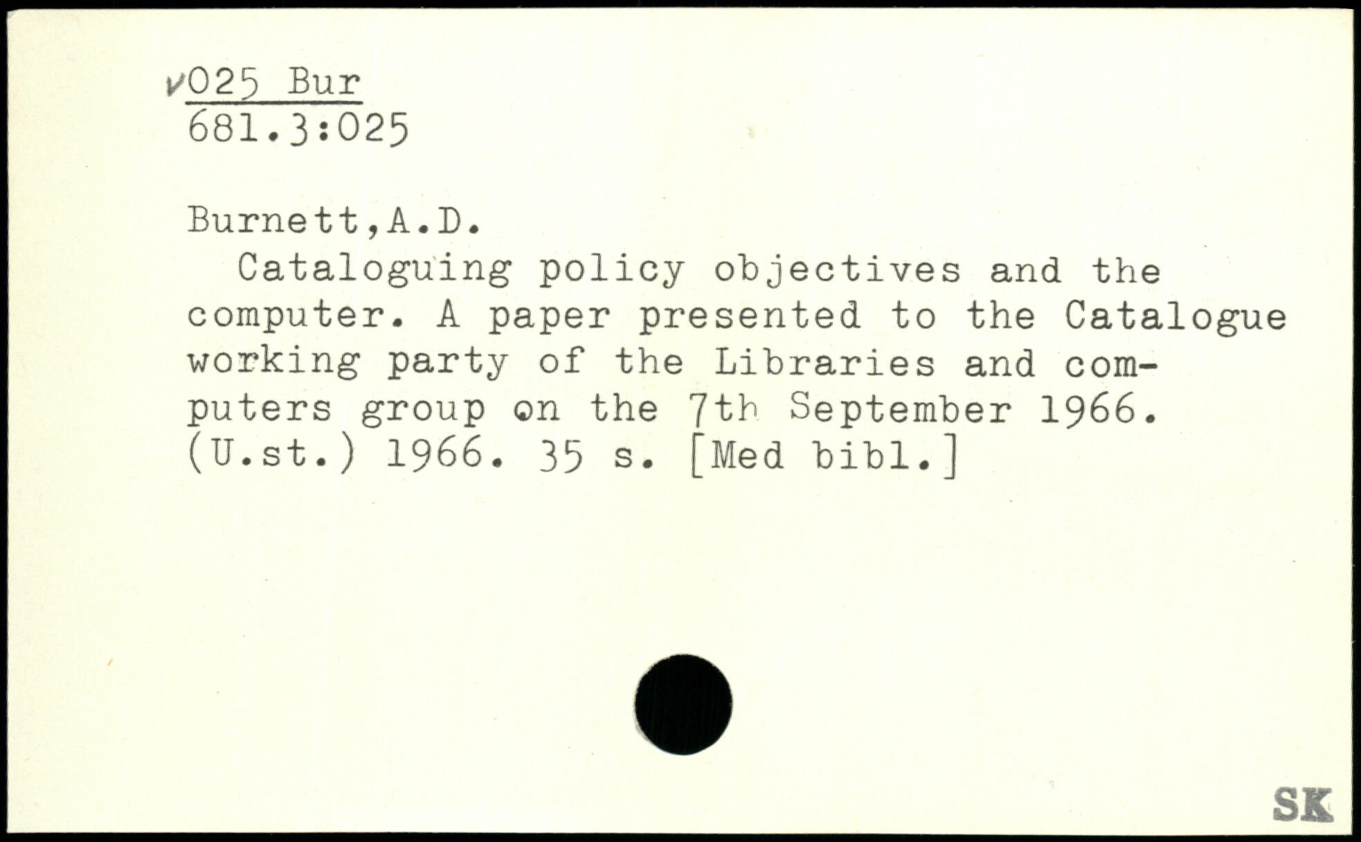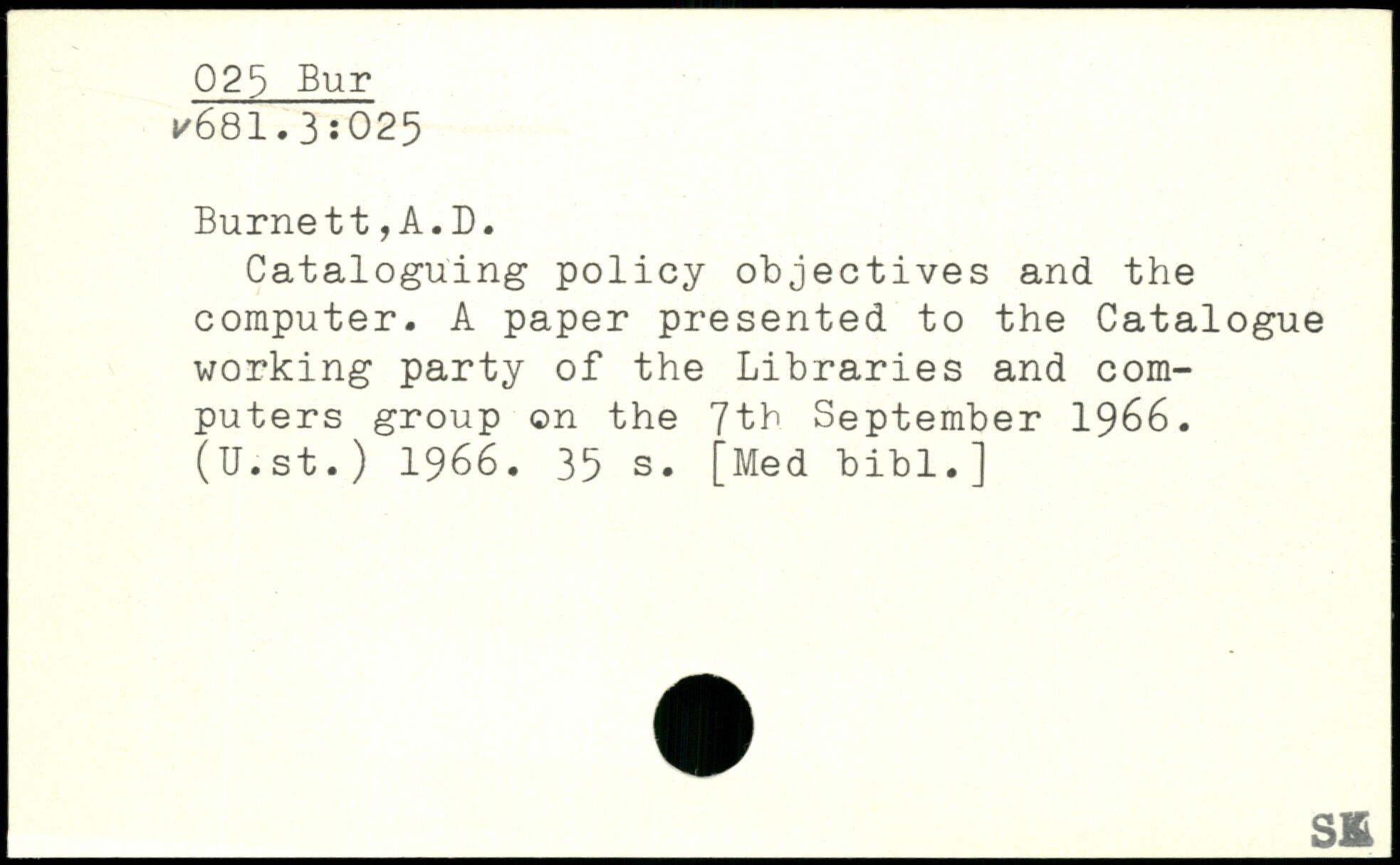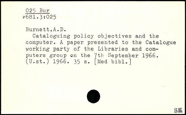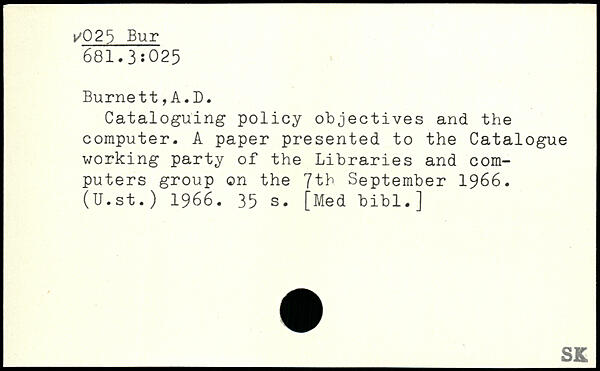 Cataloguing policy objectives and the computer. A paper presented to the Catalogue working party of the Libraries and computers group on the 7th September 1966. (U.st.) 1966.