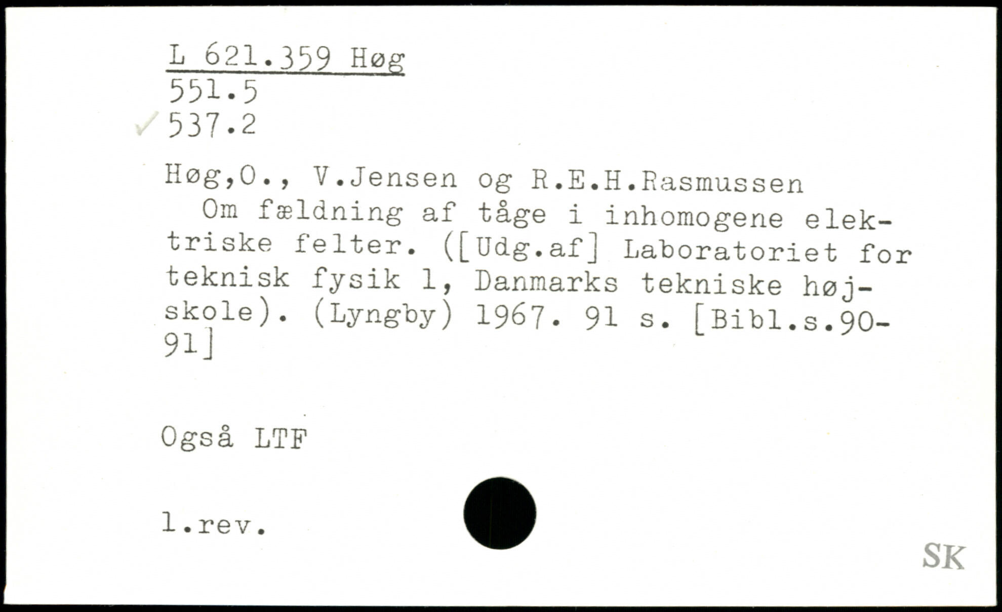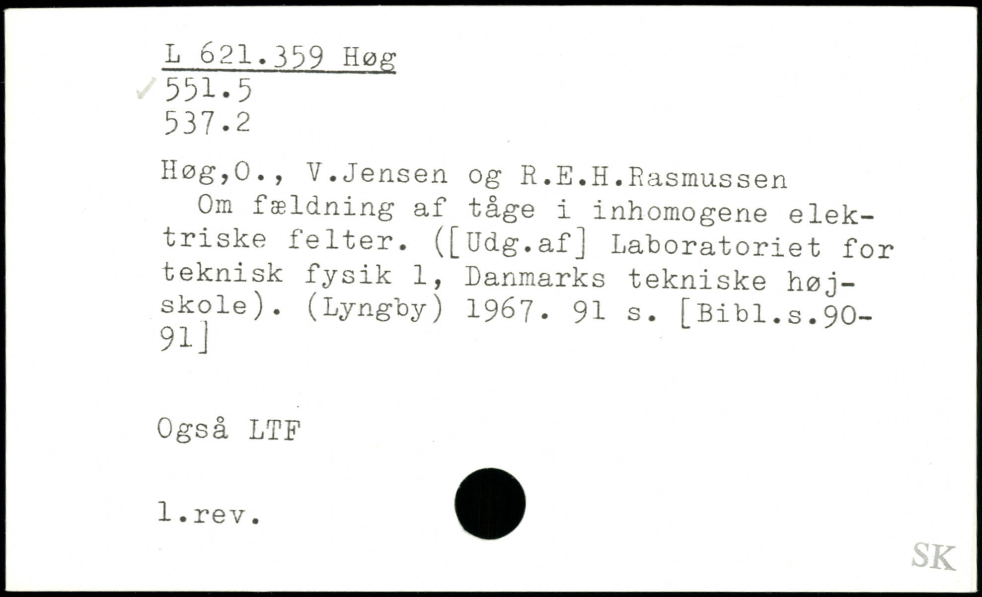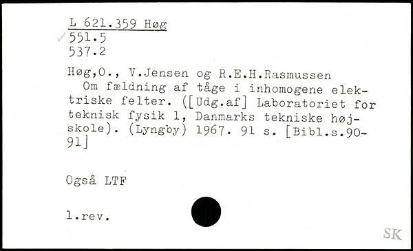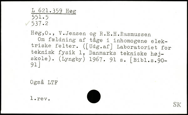 Om fældning af tåge i inhomogene elektriske felter. ([Udg.af] Laboratoriet for teknisk fysik 1, Danmarks tekniske højskole). (Lyngby) 1967.