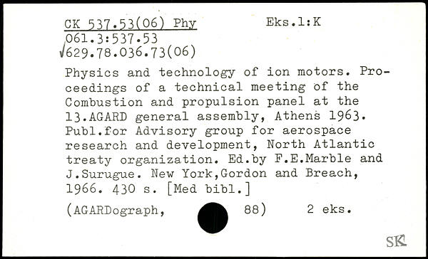 Physics and technology of ion motors. Proceedings of a technical meeting of the Combustion and propulsion panel at the 13.AGARD general assembly, Athens 1963. Publ.for Advisory group for aerospace research and development, North Atlantic treaty organization. Ed.by F.E.Marble and J.Surugue.