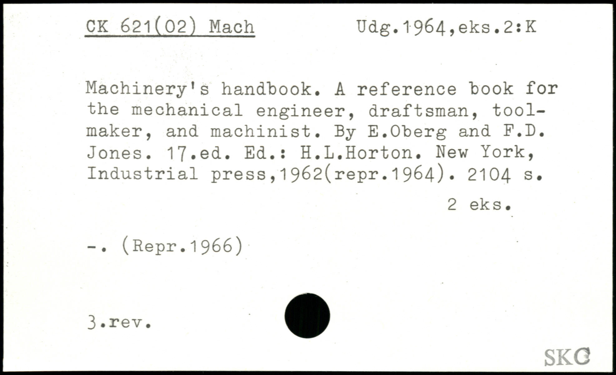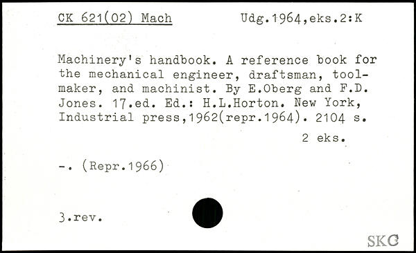 Machinery’s handbook. A reference book for the mechanical engineer, draftsman, tool-maker, and machinist. By E.Oberg and F.D. Jones. 17#ed. Ed.: H.L.Horton. New York, Industrial press,19^2(repr.1964).