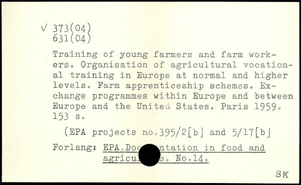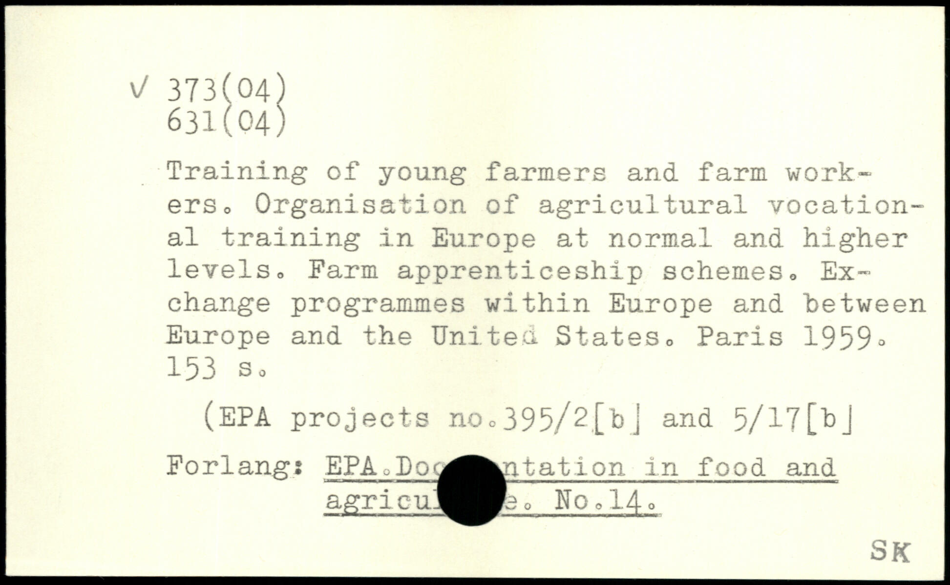 Training of young farmers and farm workers , Organisation of agricultural vocational training in Europe at normal and higher levels, Farm apprenticeship schemes, Exchange programmes within Europe and "between Europe and the United States