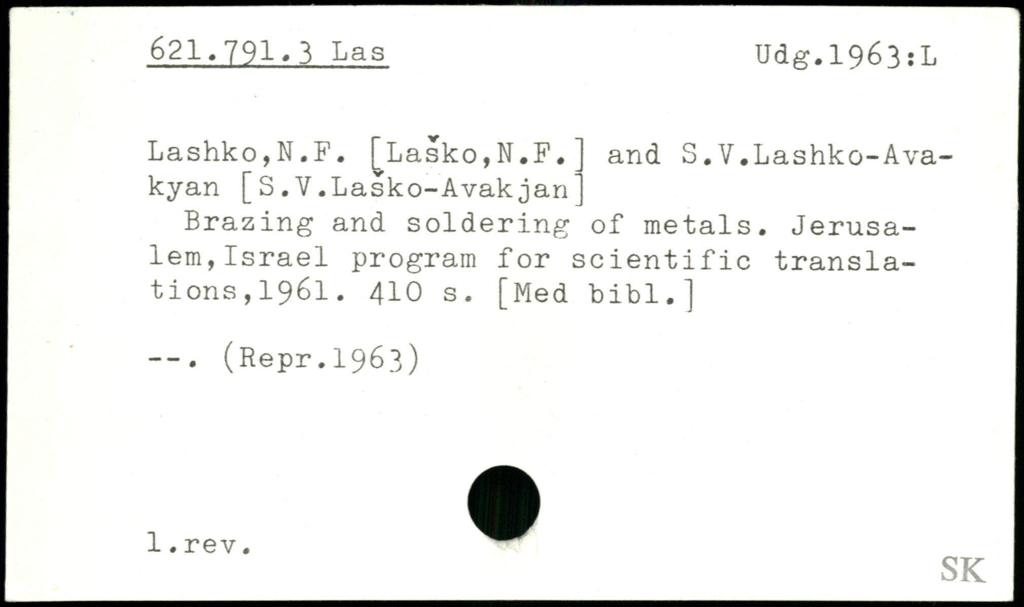 Lashko,N.F. j^Lasko,N.F. and S.V.Lashko-Ava-kyan [S.V.Lasko-Avakjan] Brazing and soldering of metals. Jerusalem, Israel program for scientific translations, 1961.