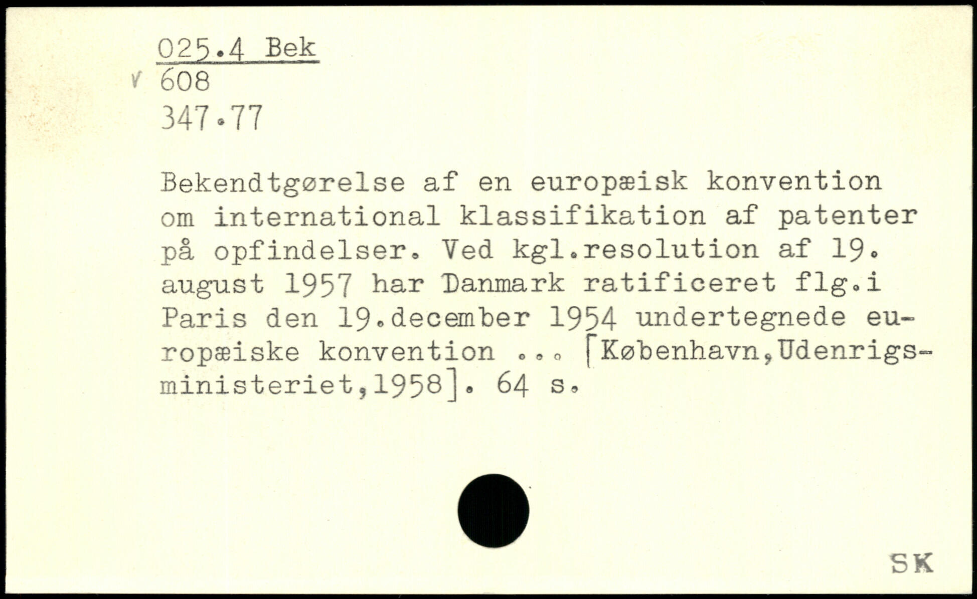 Bekendtgørelse af en europæisk konvention om international klassifikation af patenter på opfindelser. Ved kgl.resolution af 19. august 1957 har Danmark ratificeret flg.i Paris den 19.december 1954 undertegnede europæiske konvention. f