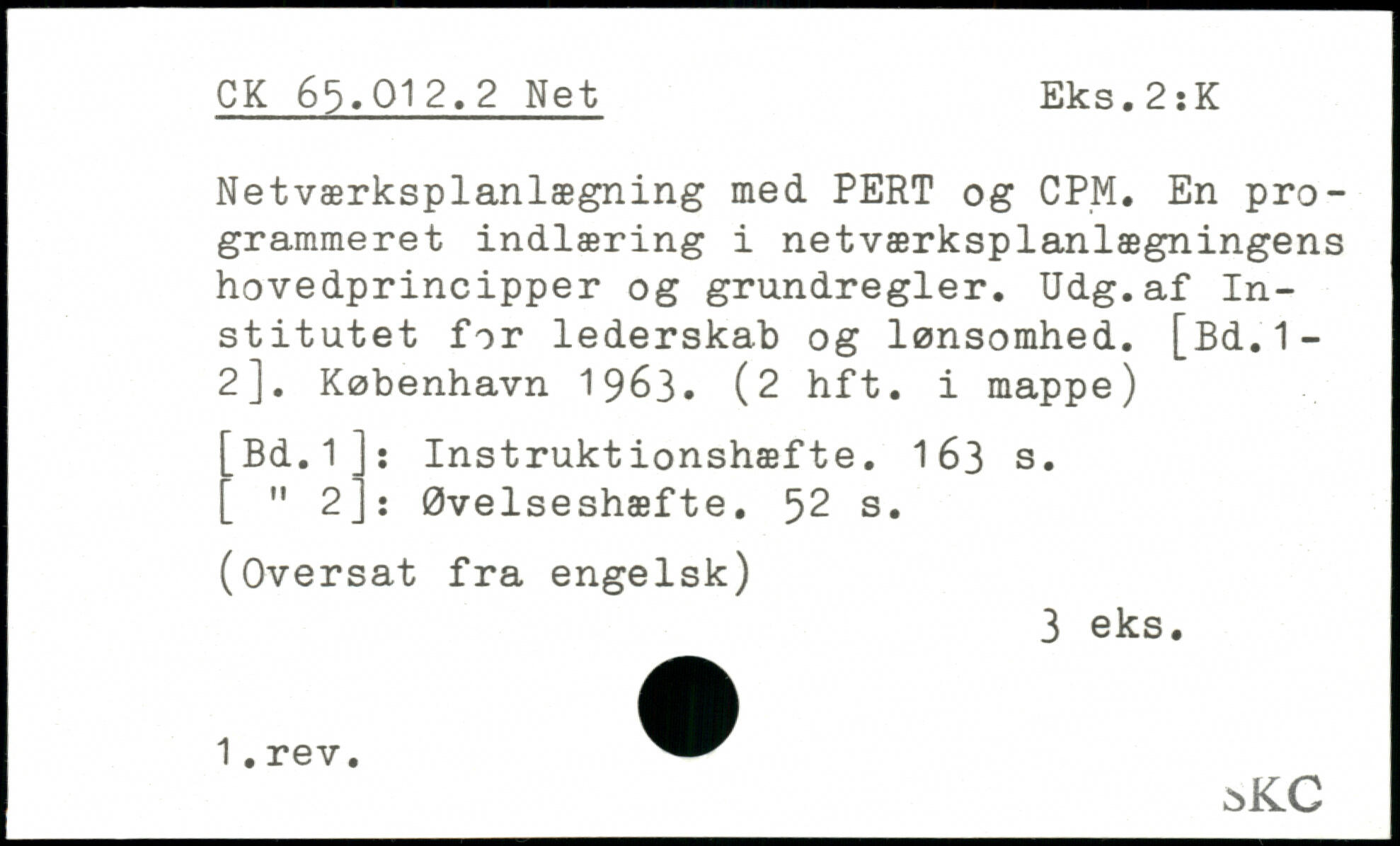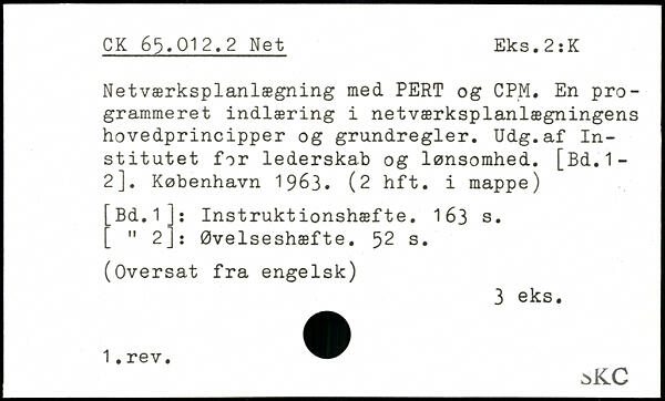 Netværksplanlægning med PERT og CPM. En programmeret indlæring i netværksplanlægningens hovedprincipper og grundregler. Udg.af Institutet for lederskab og lønsomhed. [