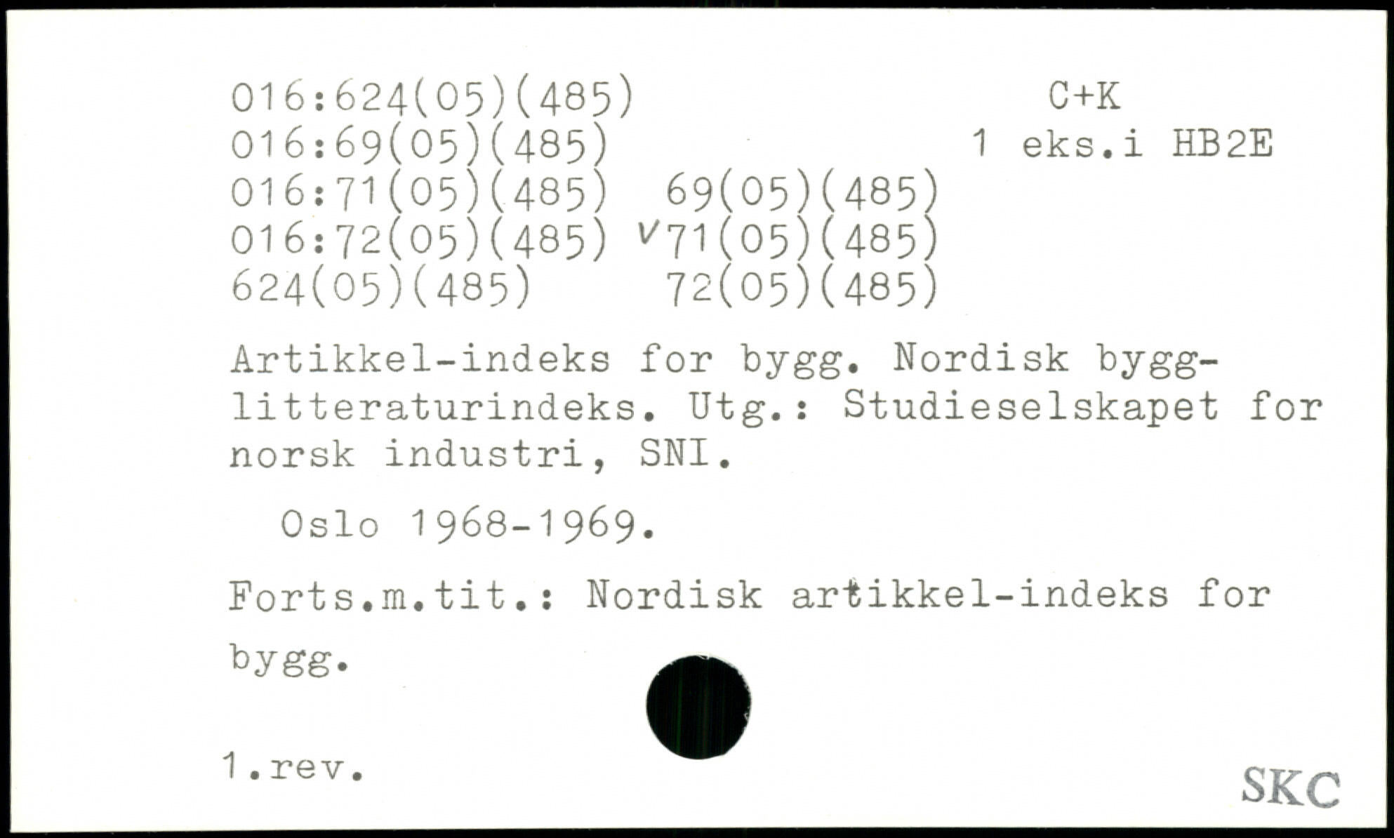 Artikkel-indeks for bygg. Nordisk bygg-litteraturindeks. Utg.: Studieselskapet for norsk industri, SNI. Oslo 1968-1969. Forts.m.tit.s Nordisk artikkel-indeks for bygg.
