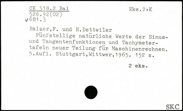 Fünfstellige natürliche Werte der Sinus-und Tangentenfunktionen und Tachymetertafeln neuer Teilung für Maschinenrechnen.