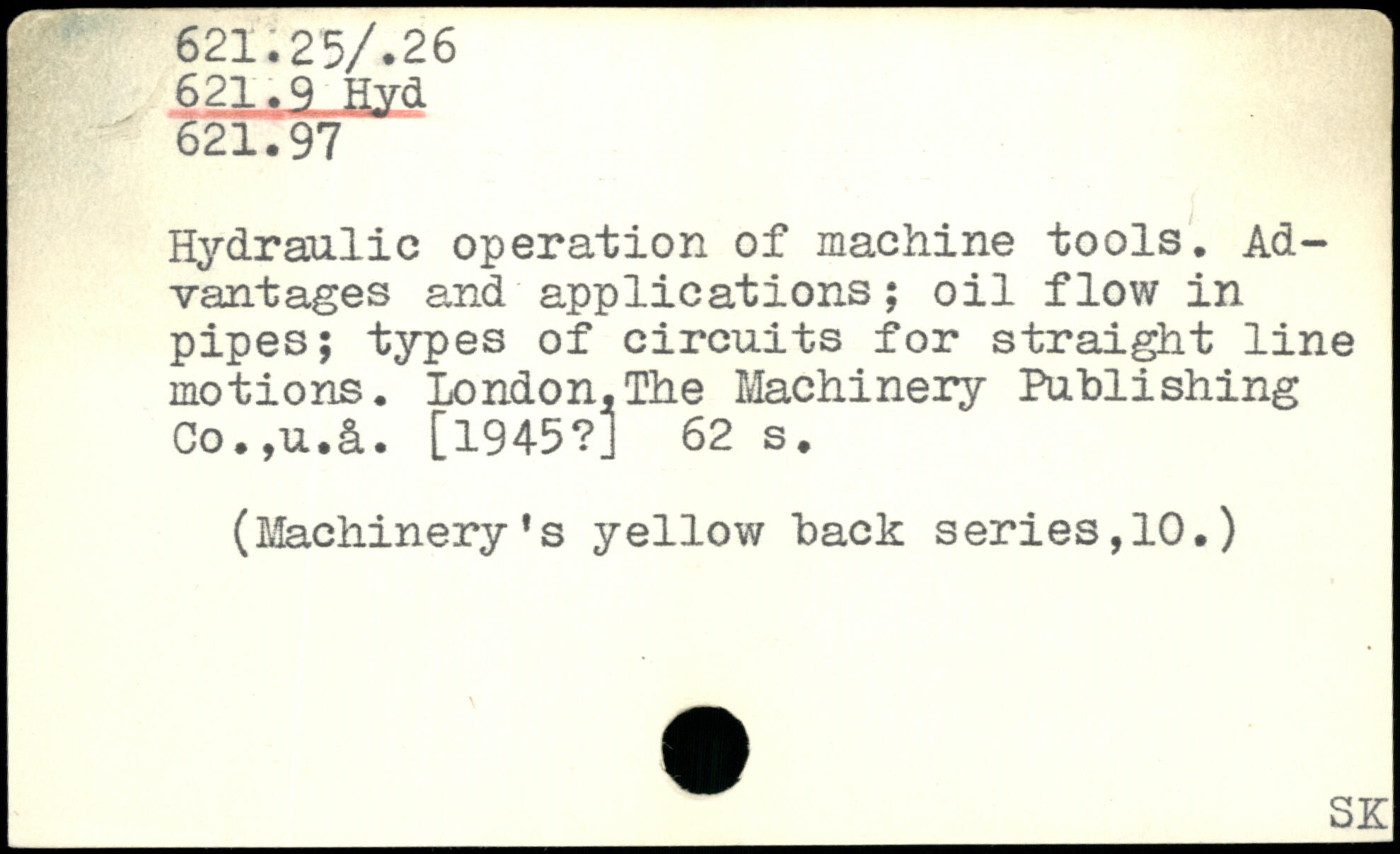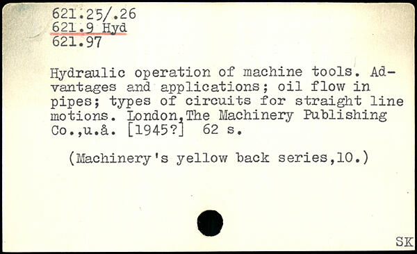 Hydraulic operation of machine tools. Advantages and applications; oil flow in pipes; types of circuits for straight line motions. London,The Machinery Publishing Co.,u.&. [1945?J