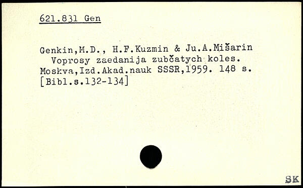 Genkin,M.D., H.P.Kuzmin & Ju.A.Misarin Voprosy zaedanija zubcatych koles. Moskva,Izd.Akad.nauk SSSR,1959.