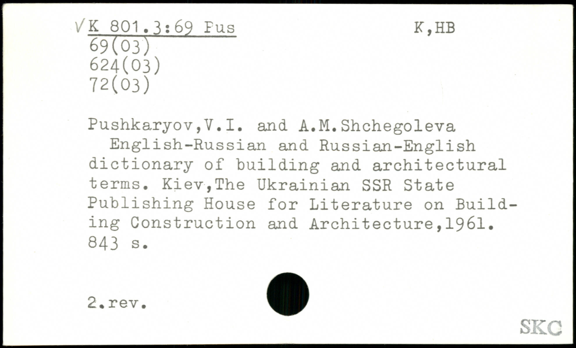 Pushkaryov,V.I. and A.M.Shchegoleva English-Russian and Russian-English dictionary of building and architectural terms. Kiev,The Ukrainian SSR State Publishing House for Literature on Building Construction and Architecture,1961.