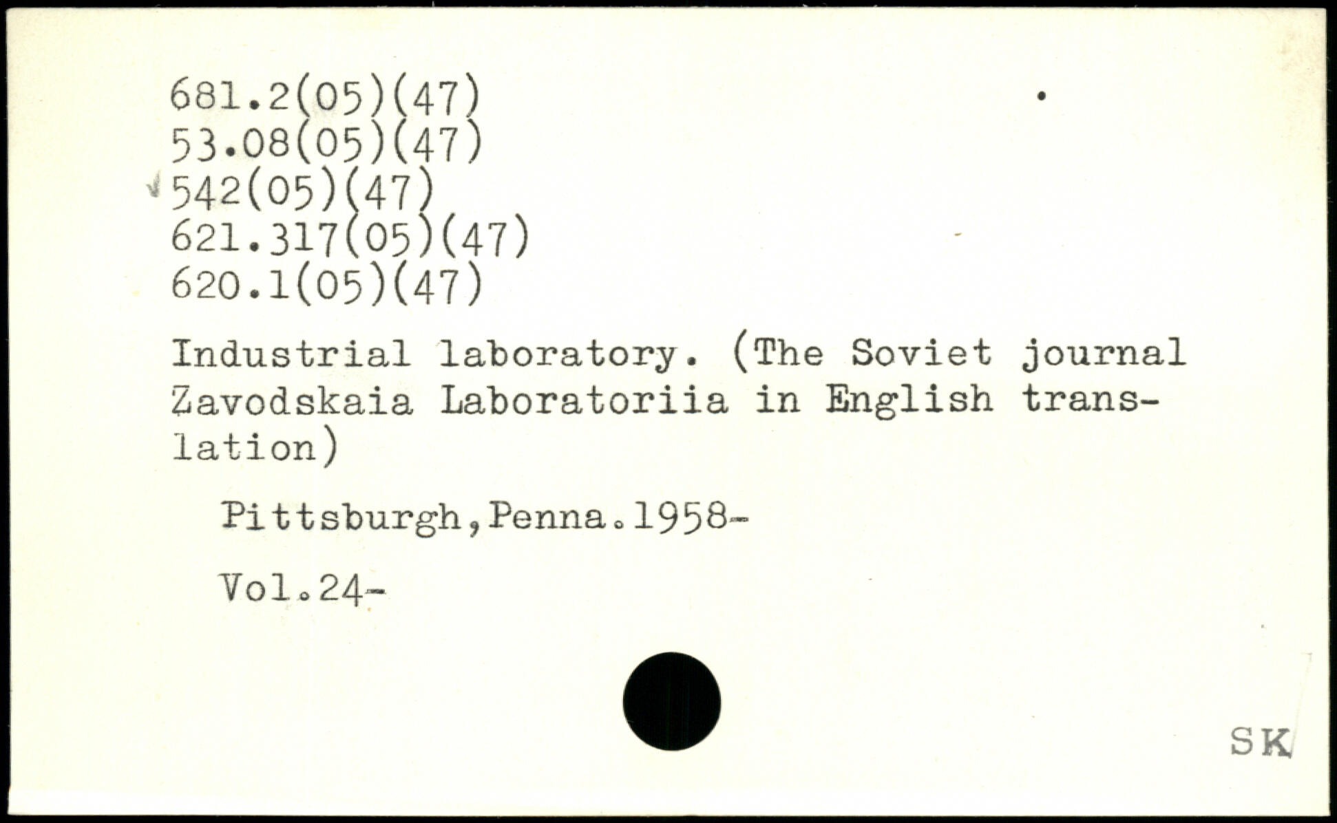 Industrial laboratory. (The Soviet journal Zavodskaia Laboratoriia in English translation) Pittsburgh,Pennao1958~ ¥ol0 24~