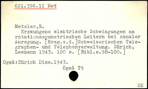 Erzwungene elektrische Schwingungen an rotationssymmetrischen Leitern bei zonaler Anregung. [Hrsg.v.d.]Schweizerischen Telegraphen- und Telephonverwaltung. Zürich, Leemann 1943.