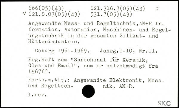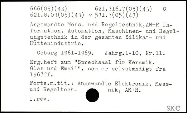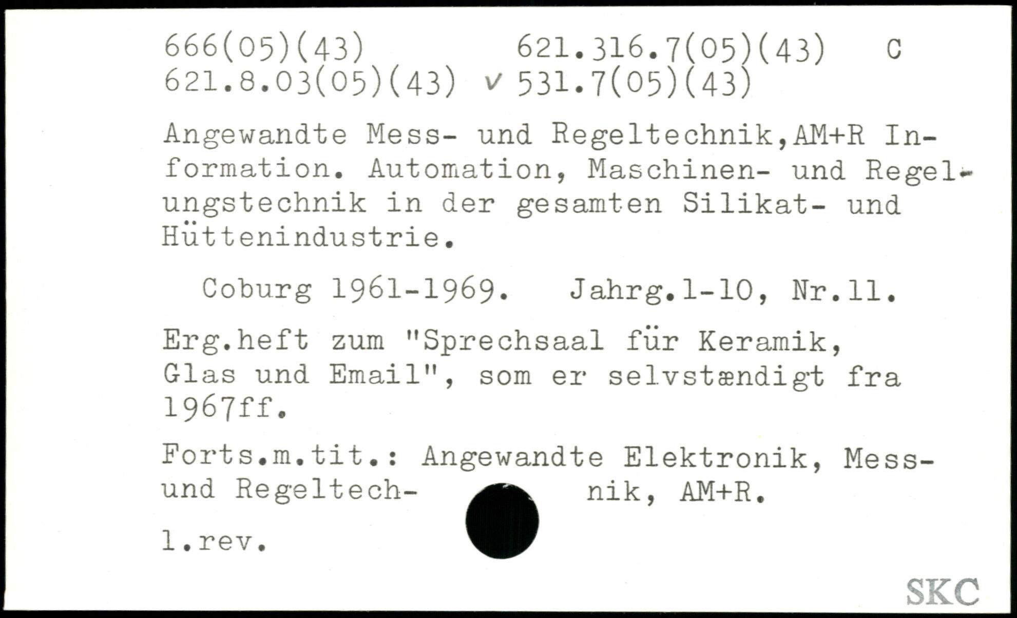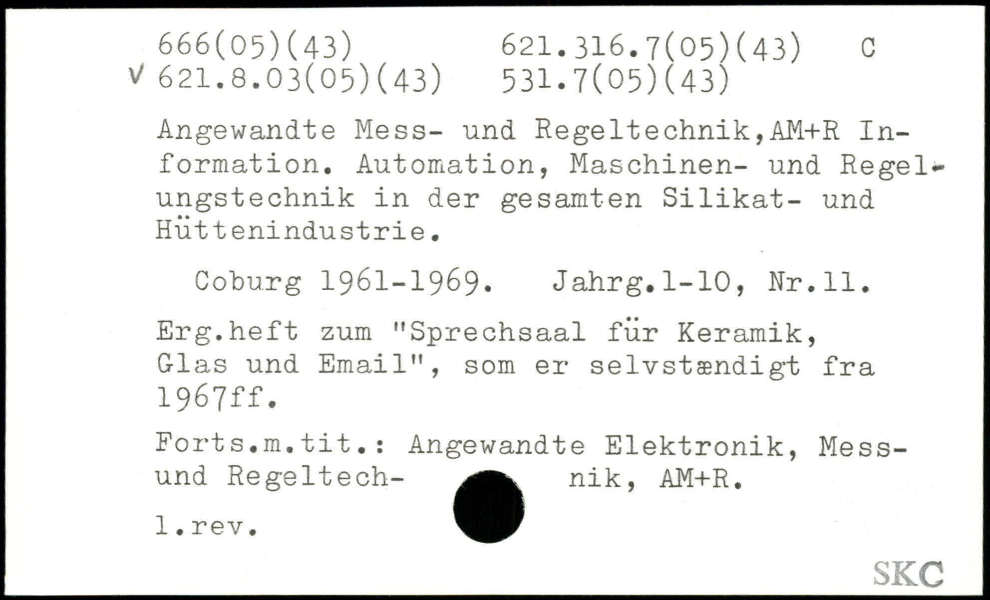Angewandte Mess- und Regeltechnik,AM+R Information. Automation, Maschinen- und Regelungstechnik in der gesamten Silikat- und Hüttenindustrie. Coburg 1961-1969. Jahrg.1-10, Nr.11. Erg.heft zum "Sprechsaal für Keramik, Glas und Email", som er selvstændigt fra 1967ff. Forts.m.tit.: Angewandte Elektronik, Mess-und Regeltech- nik, AM+R. l.rev.