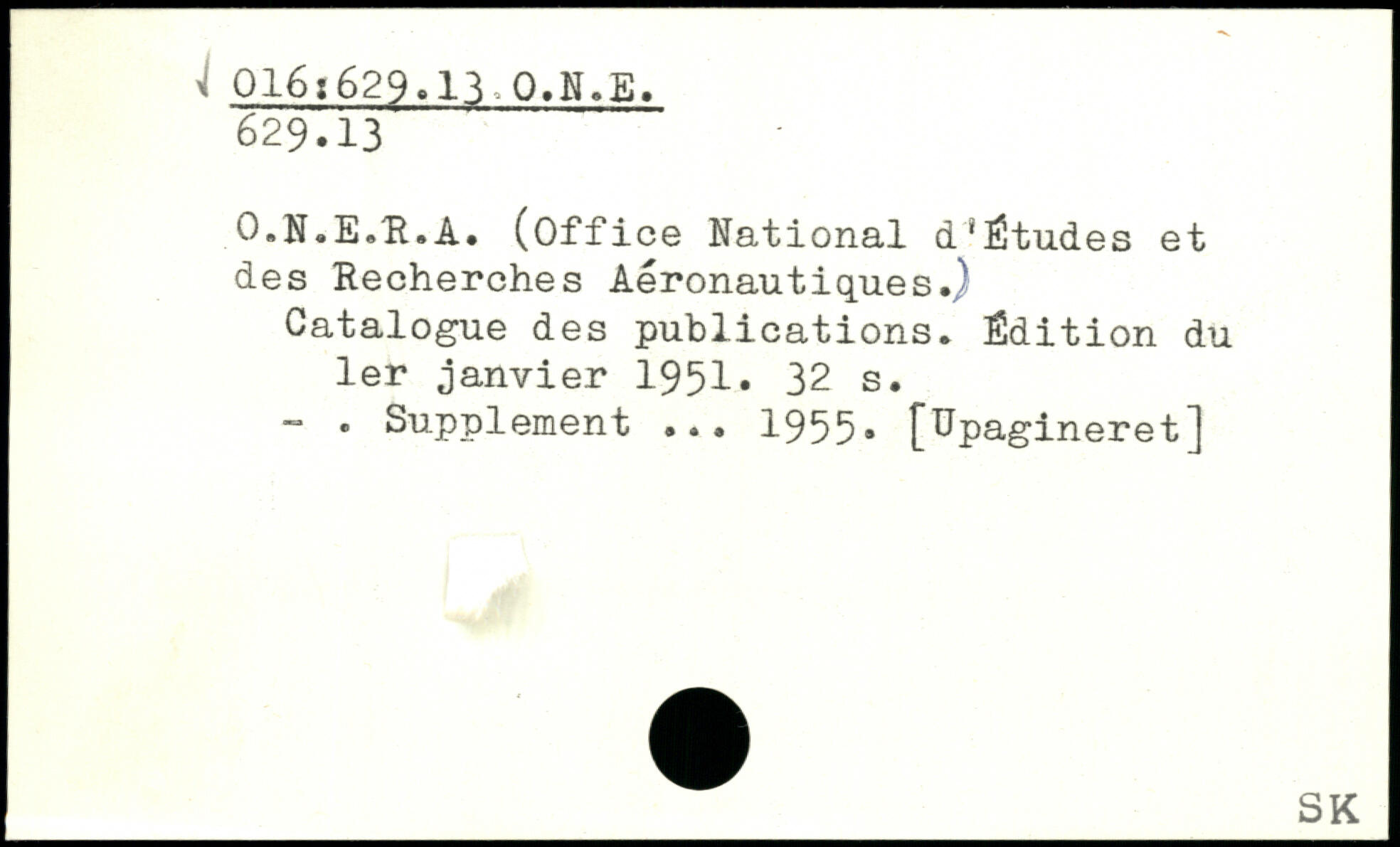 O.N.E.R.A. (Office National d.Études et des Recherches Aéronautiques.) Catalogue des publications. Édition du 1er janvier 1951