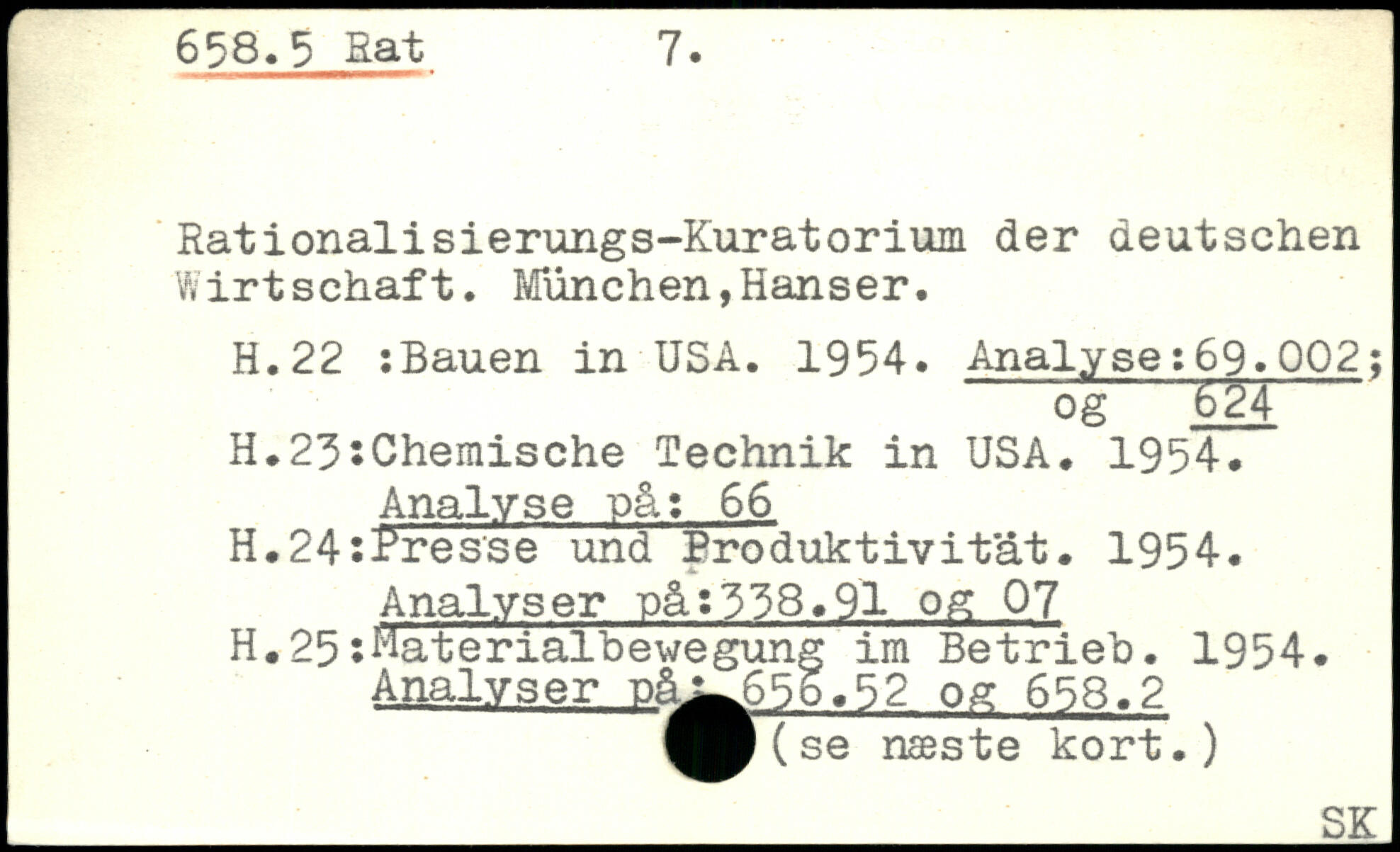 Rationalisierungs-Kuratorium der deutschen Wirtschaft. München,Hanser. H.22 :Bauen in USA. 1954. Analyse:69.002; ög 624 H.23:Chemische Technik in USA. 1954. Analyse oå: 66 H. 24:Presse und Produktivität. 1954. Analyser på:558.91 og 07 H.25:^aterialbewegung im Betrieb. 1954. Analyser p^^65b.52 og 668.2 ^B(se næste kort. )