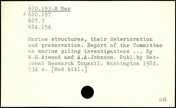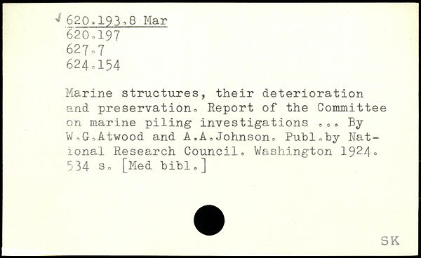 Marine structures, their deterioration and preservation. Report of the Committee on marine piling investigations 0 ,, By WoG,Atwood and A.A,Johnson
