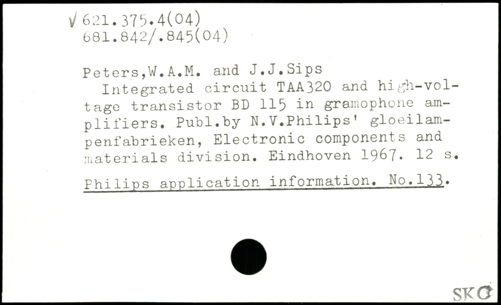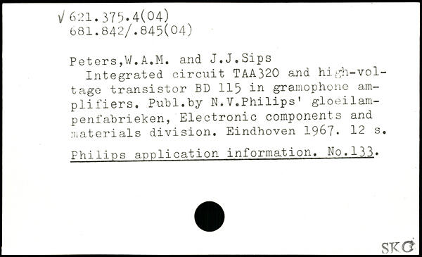 Integrated circuit TAA320 and high-voltage transistor BD 115 in gramophone amplifiers. Publ.hy N.V.Philips’ gloeilam-penfabrieken, Electronic components and materials division. Eindhoven 196?.