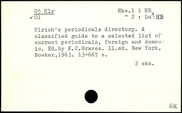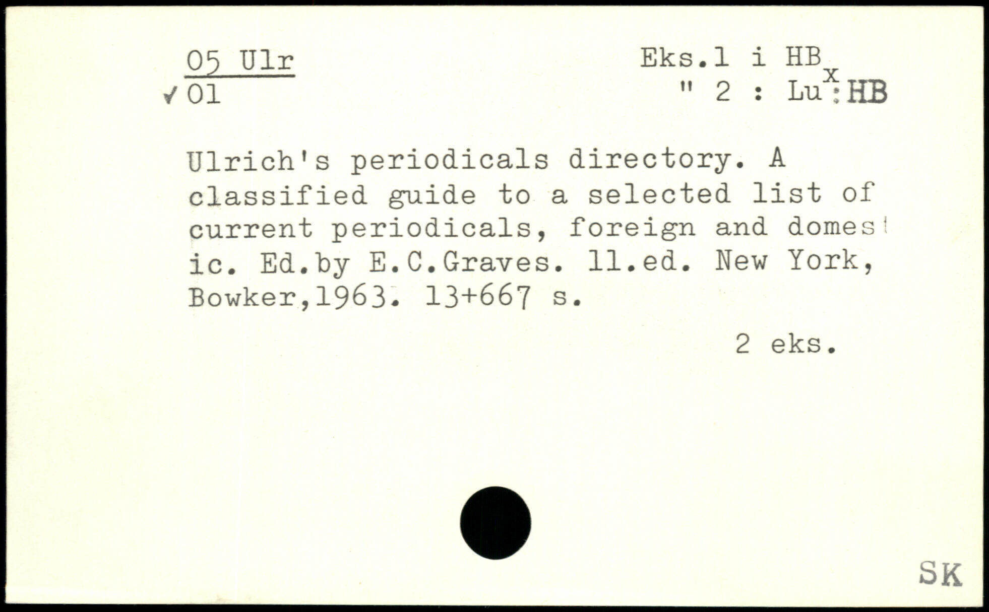 Ulrich's periodicals directory. A classified guide to a selected list of current periodicals, foreign and domes! ic. Ed."by E.C.Graves.