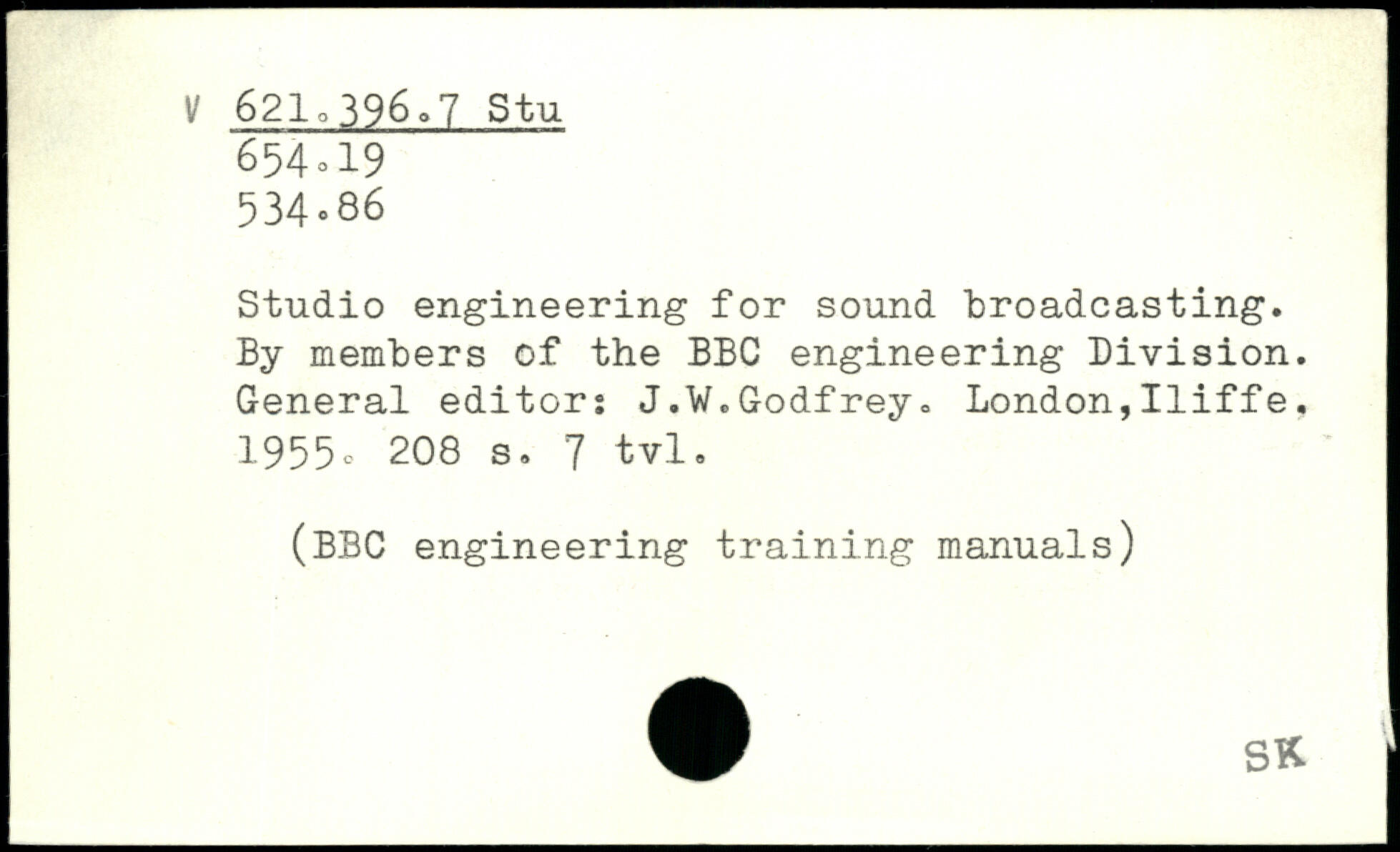 Studio engineering for sound broadcasting. By members of the BBC engineering Division. General editor: J.WoGodfrey,, London,Iliffe. 1955=