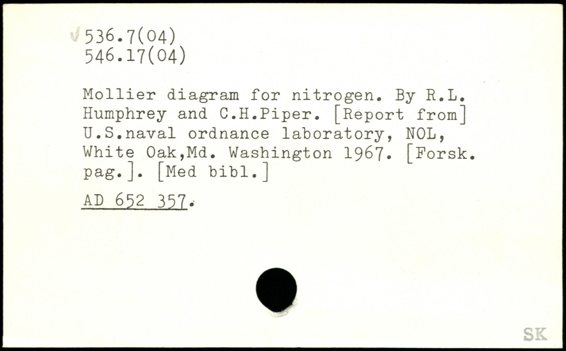 Mollier diagram for nitrogen. By R.L. Humphrey and C.H.Piper. [Report from] U.S.naval ordnance laboratory, NOL, White Oak,Md.