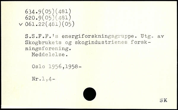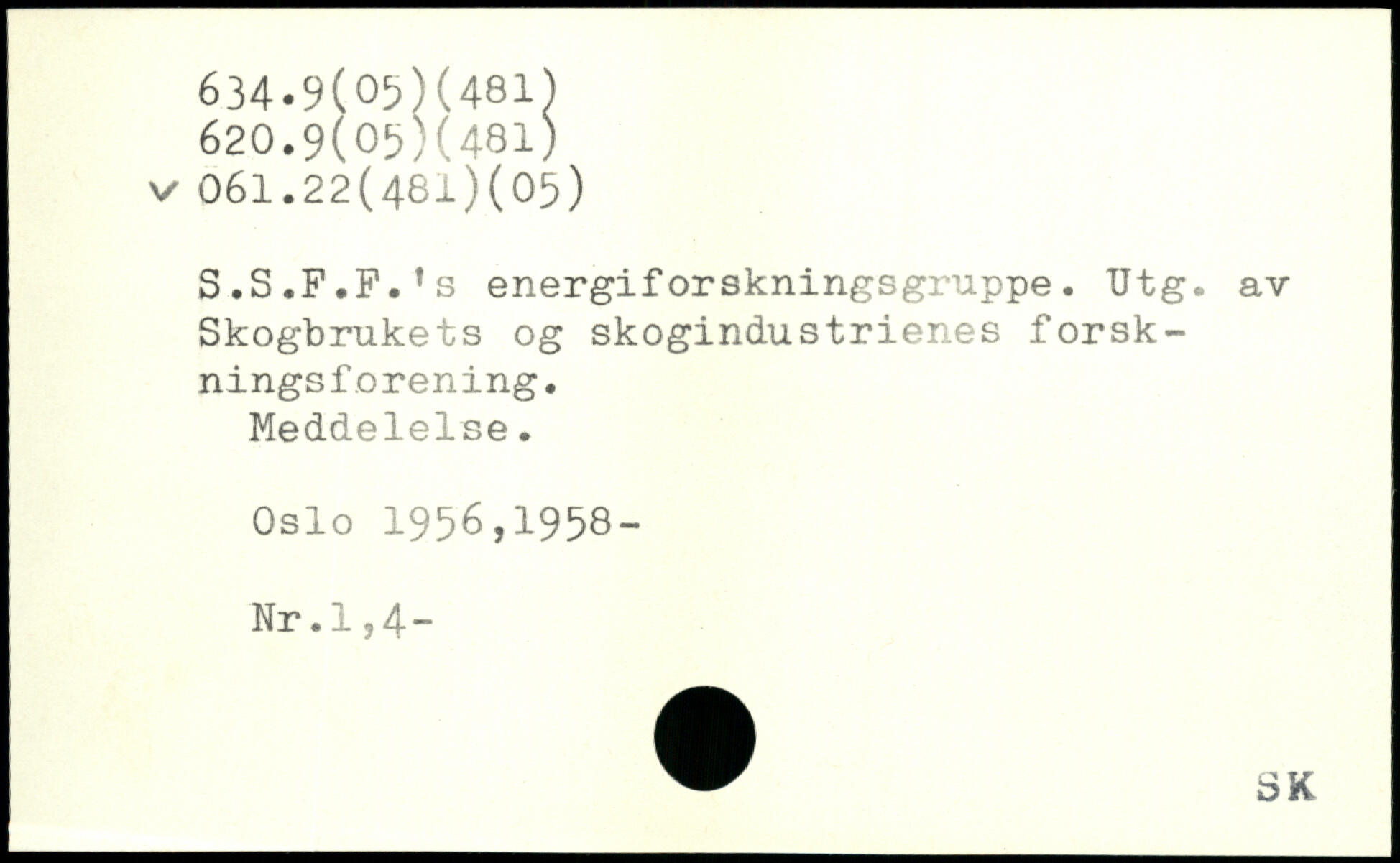 S.S.F.F.’s energiforskningsgruppe. Utg. av Skogbrukets og skogindustrienes forskningsf orening. Meddelelse. Oslo 1956,1958- Nr.1,4-