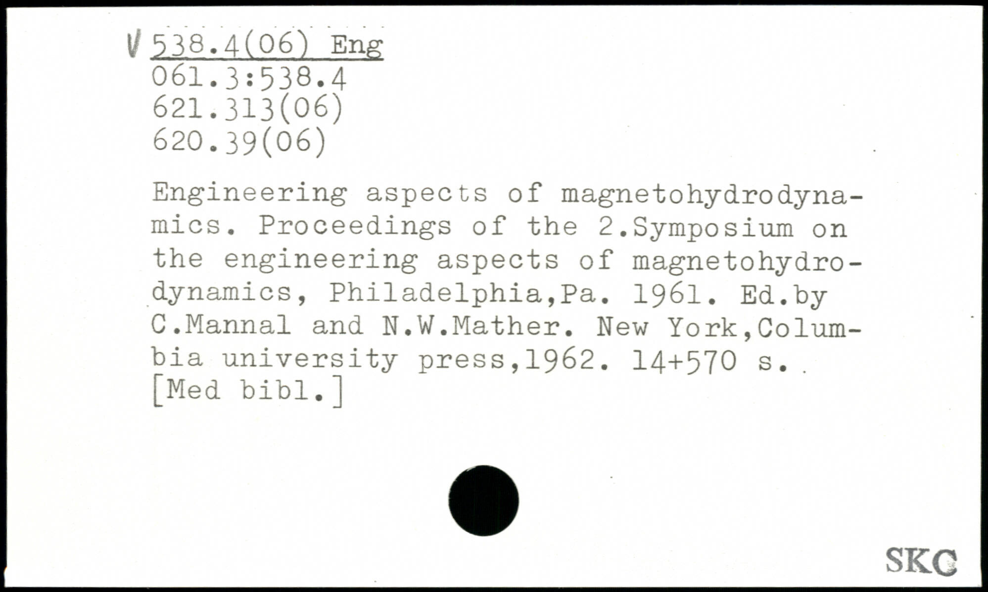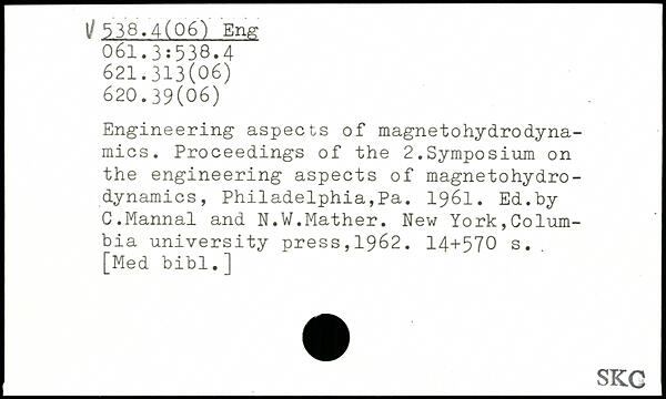 Engineering aspects of magnetohydrodynamics. Proceedings of the 2.Symposium on the engineering aspects of magnetohydrodynamics, Philadelphia,Pa. 1961. Ed.by C.Mannal and N.W.Mather.