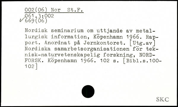 Nordisk seminarium om uttjande av metallurgisk information, Köpenhamn 1966. Rapport. Anordnat på Jernkontoret. [Utg.av] Nordiska samarbetsorganisationen för tek-nisk-naturvetenskapelig forskning, N0RD-FORSK. Köpenhamn 1966.
