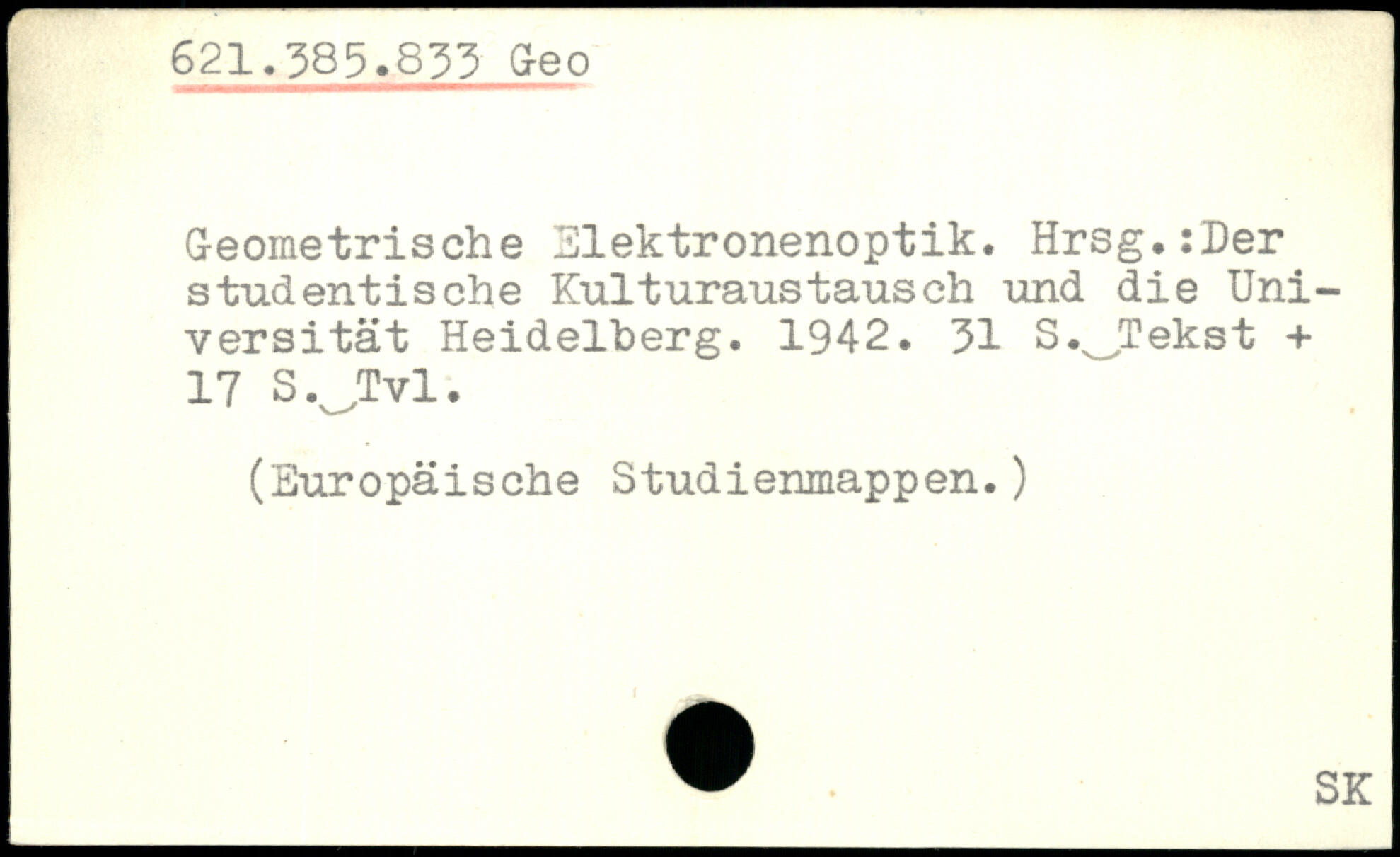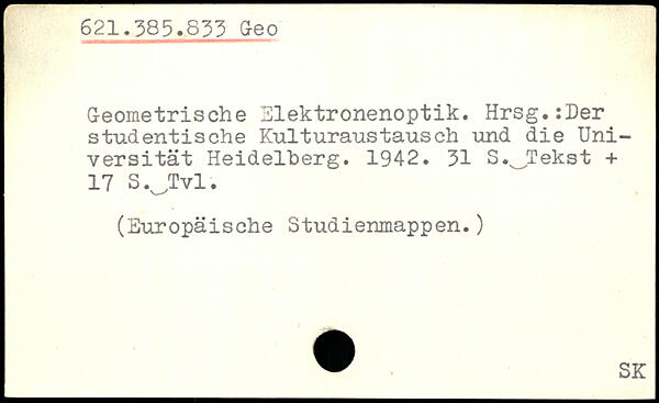 Geometrische Elektronenoptik. Hrsg.:Der studentische Kulturaustausch und die Universität Heidelberg. 1942.